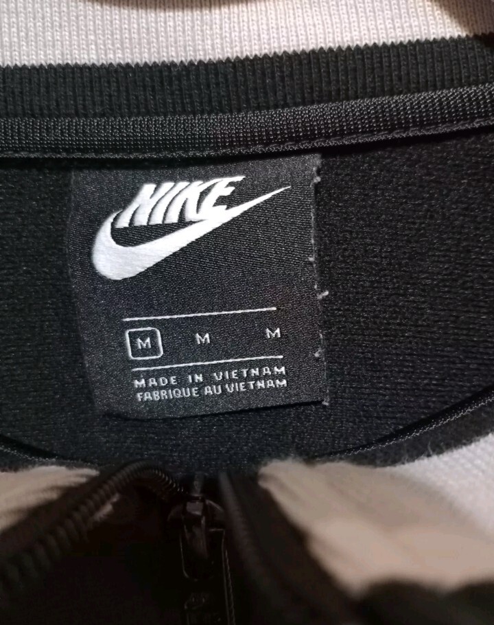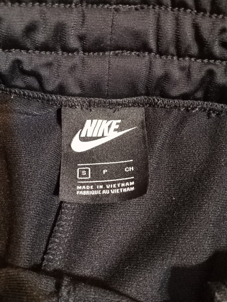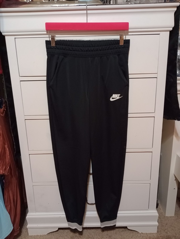 The Nike Sportswear Women's Heritage Black Poly Knit Jacket is a pair of pants in size M with a tapered leg and a black/white color pattern. These pants feature an elastic waist for easy wear and are made of 100% polyester blended fabric. They are suitable for travel, activewear, and casual occasions during the winter, fall, and spring seasons. The Nike Heritage line ensures a regular fit for comfortable wear, making them a stylish and practical choice for athleisure outfits.