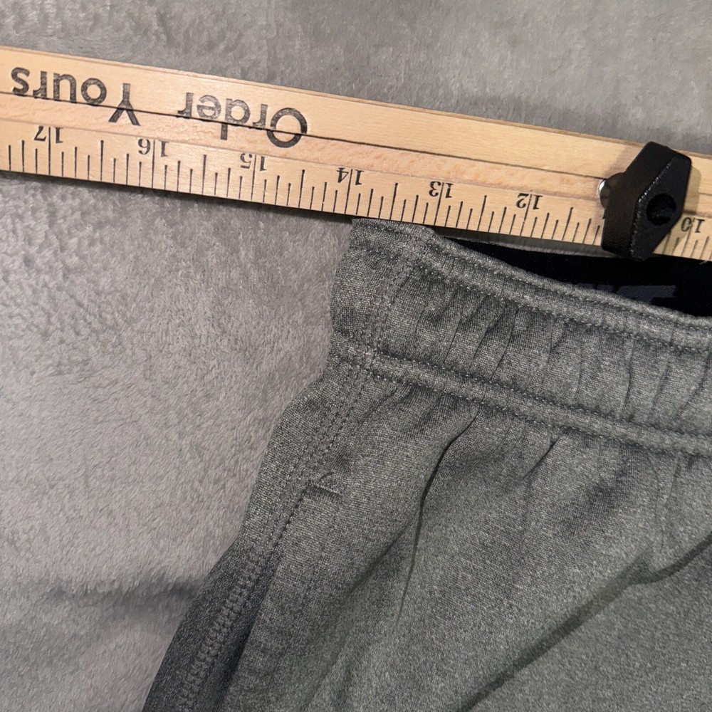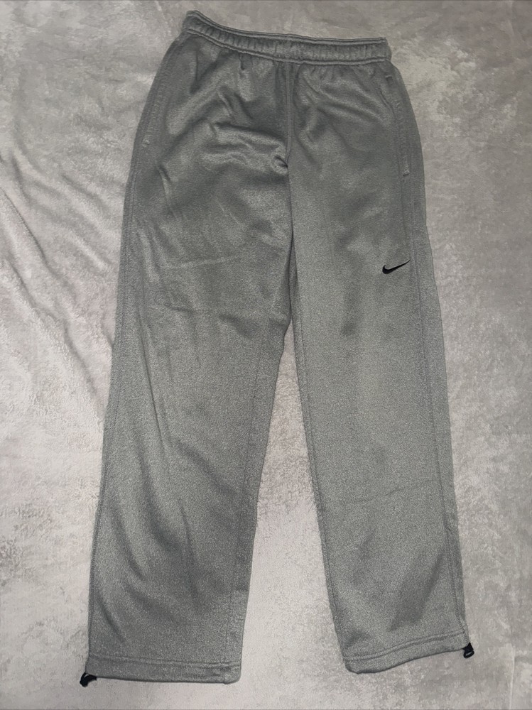 Get ready for your workout with these Nike THERMA-FIT Training sweatpants. The gray pants feature an elastic waistband, drawstring closure, and straight leg style for a relaxed fit. Made of polyester and lined with fleece, these pants are perfect for gym and training activities, including crossfit, track and field, running, and jogging. Other features include pockets, moisture wicking, breathability, and thermal insulation. The Nike logo on the pants adds a sporty touch. These pants are size S with a waist size of 31 inches and inseam length of 33 inches. Ideal for men who want to perform their best during their workouts, these Nike pants offer comfort and style.