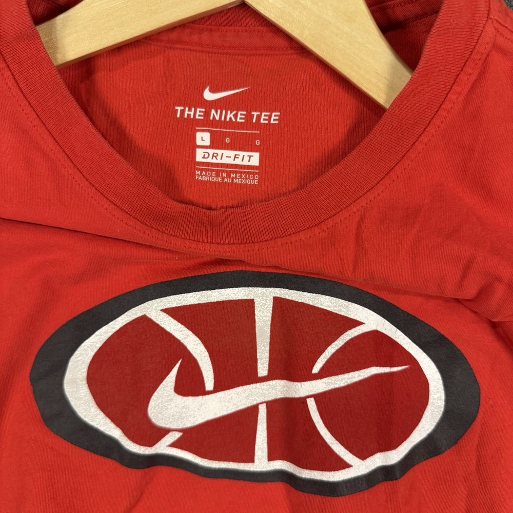 • Size: L / Large (Mens) • Condition: Good – light wear, no major flaws • Material: Polyester blend (Dri-Fit performance fabric) • Made in Mexico • Features: Short sleeve, crewneck, basketball logo graphic, moisture-wicking Fast handling – ships out in 1 business day Measurements are in photos. Sizes may vary, so we recommend measuring a similar item you own and comparing with measurements above. Measurements are approximate. Thank you!