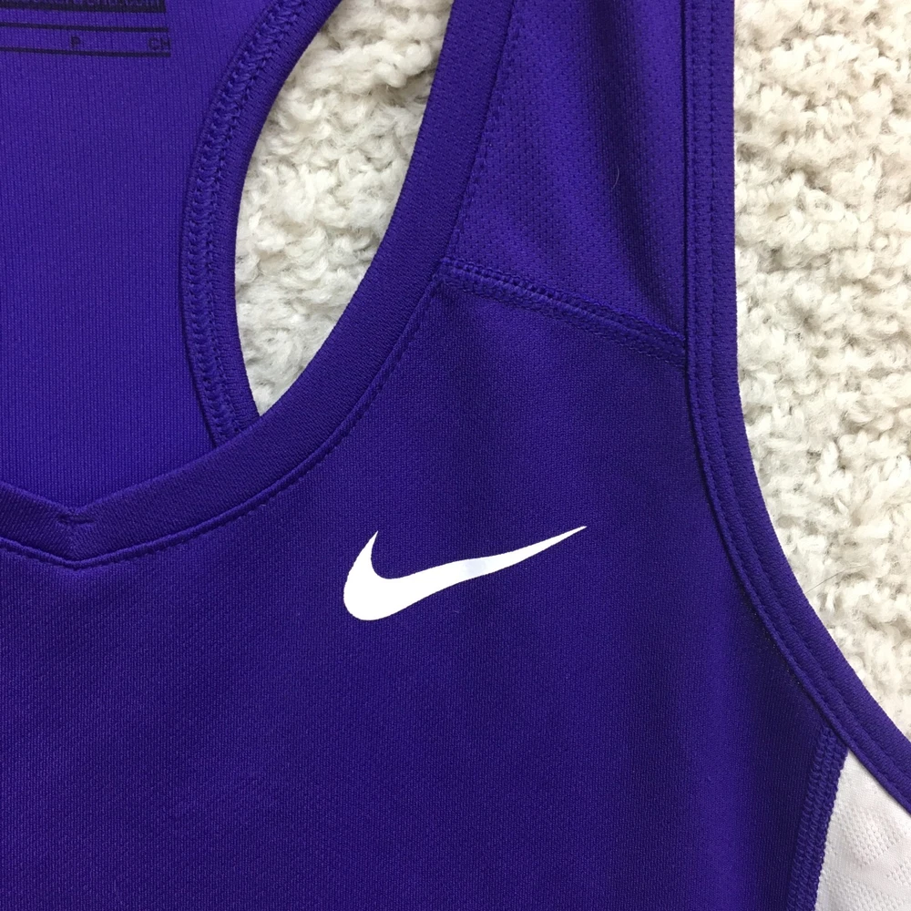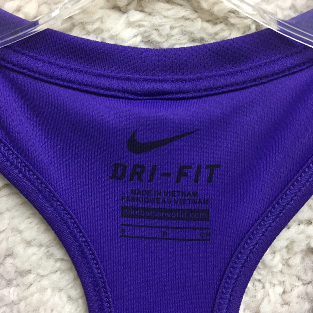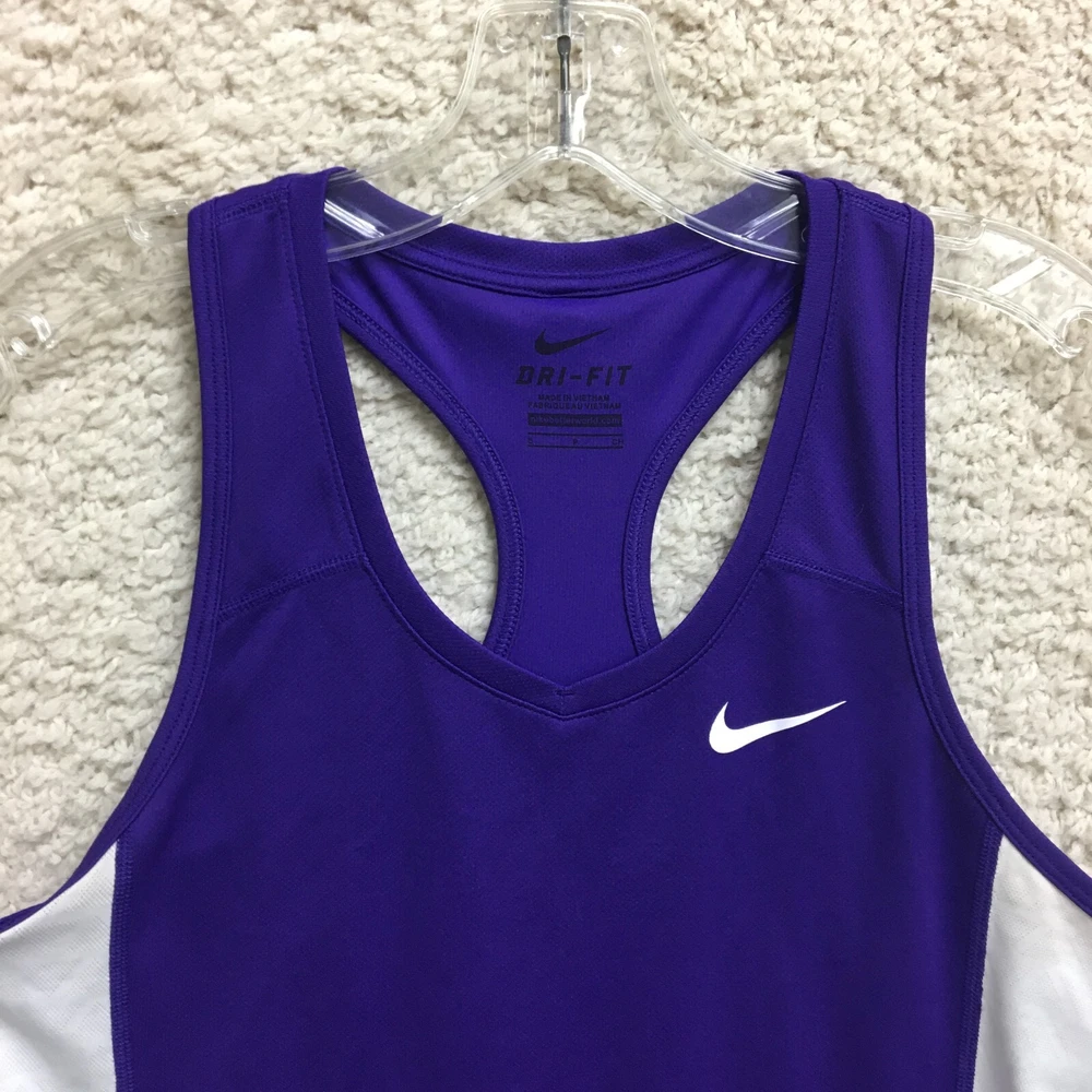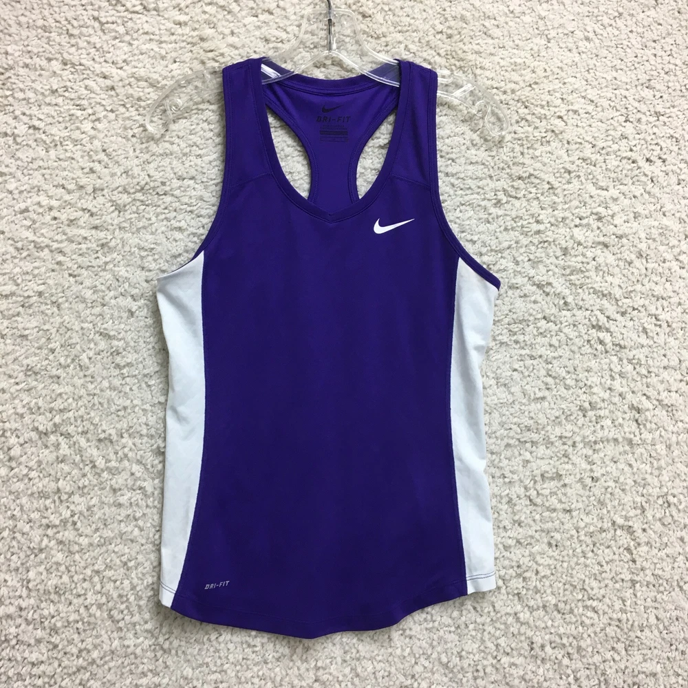 Material: Polyester Size: S Fit: Athletic Color: Purple Seller Notes: “Good Used Condition. Please, See Pictures for Full Condition and Measurements.” Sleeve Length: Sleeveless Performance/Activity: Gym & Training, Running & Jogging, Walking Country/Region of Manufacture: Vietnam Style: Basic Season: Fall, Spring, Summer, Winter Size Type: Regular Fabric Wash: Medium Strap Type: Racerback Department: Women Brand: Nike Pattern: Solid Neckline: Round Neck Closure: Pullover Model: Nike Dri-Fit Garment Care: Machine Washable Product Line: Nike Dri-FIT Theme: Logo Occasion: Activewear, Casual Features: All Seasons, Easy Care, Stretch Fabric Type: Blended Fabric Type: Tank