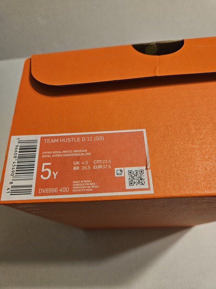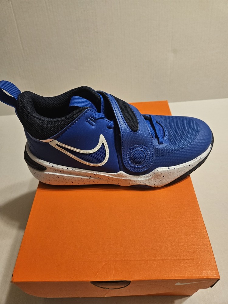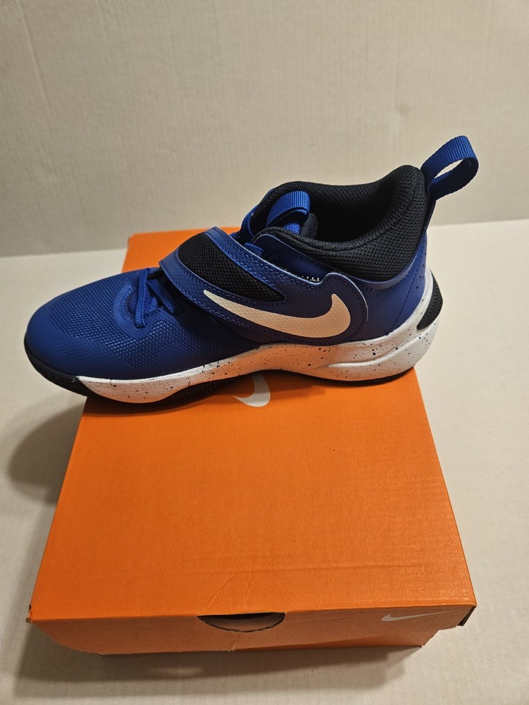 The Nike Team Hustle D11 Youth Size 5Y Royal Blue Basketball Shoes (DV8996-400) are a stylish and functional option for young basketball players. With a round toe shape, lace-up closure, and mid-top shoe shaft style, these shoes offer a comfortable fit for active boys. Made with a blended fabric upper and rubber outsole, they provide durability and performance on the court. The breathable design, cushioned insole, and standard shoe width make them suitable for a variety of activities beyond basketball, such as running, jogging, and cross training. Featuring the iconic Nike logo and basketball theme, these shoes are a solid choice for young athletes.