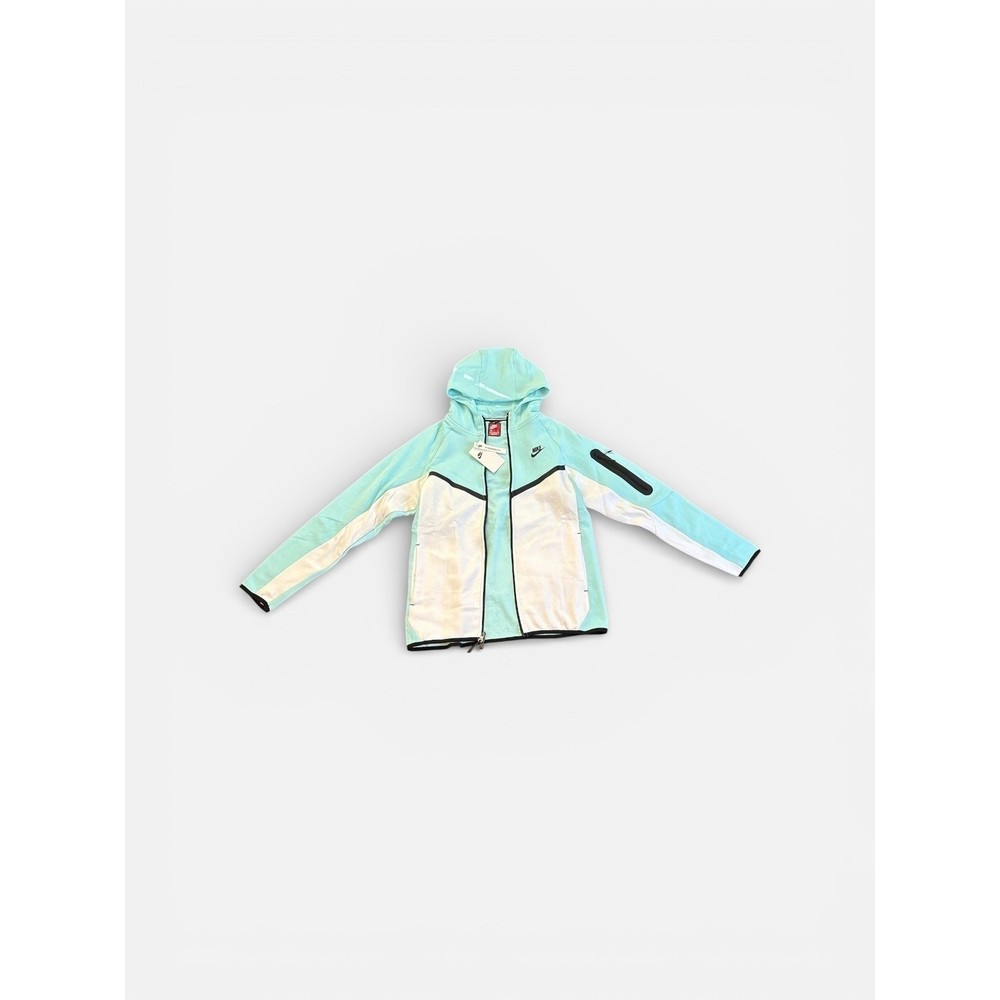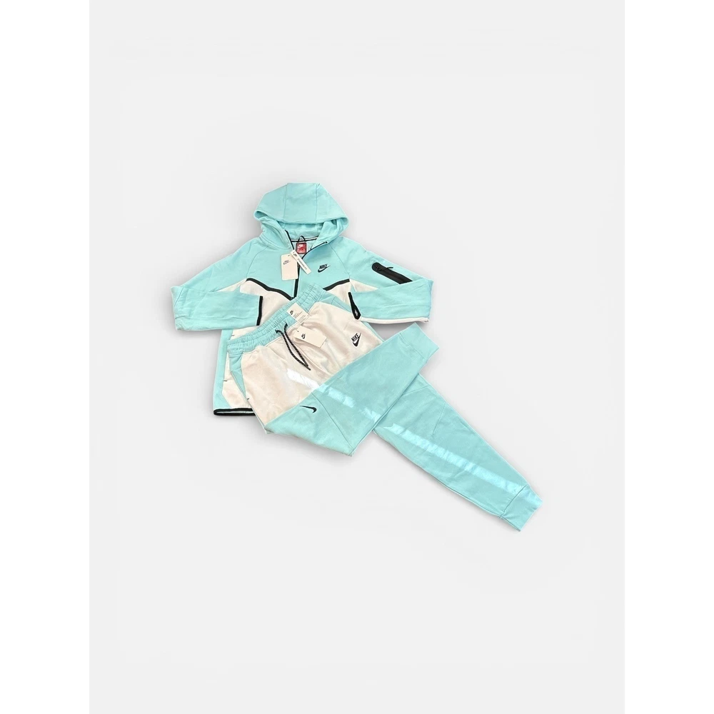 Nike Tech Fleece tracksuit set in a striking Baltic Blue and White colorway. This two-piece set includes a full-zip hoodie and matching jogger pants, both constructed from lightweight yet warm Tech Fleece fabric. The hoodie features the signature chevron design on the chest, a bonded zip pocket on the sleeve, and a scuba hood for extra coverage. The joggers offer a slim fit with an elastic waistband, internal drawstring, and the iconic vertical zippered pocket on the right hip. Both pieces are finished with black trim accents and the classic Futura logo.