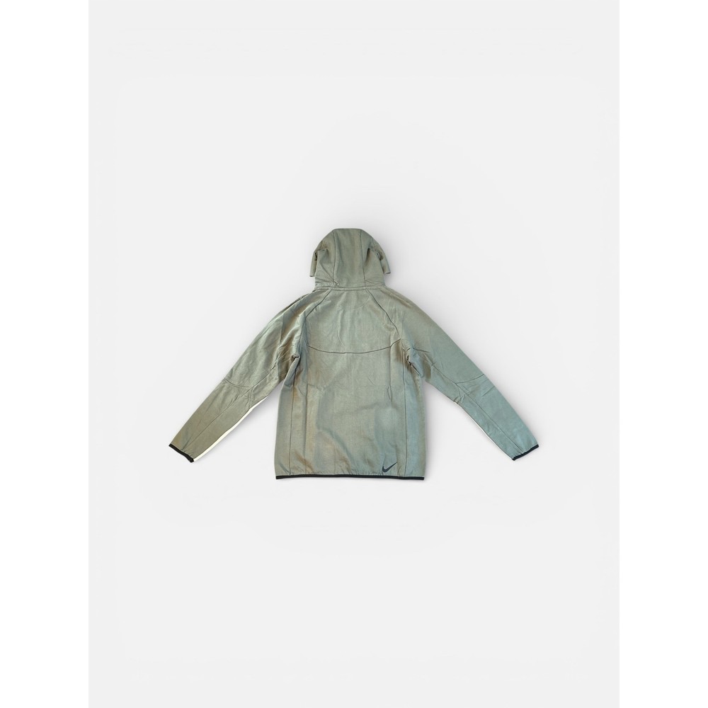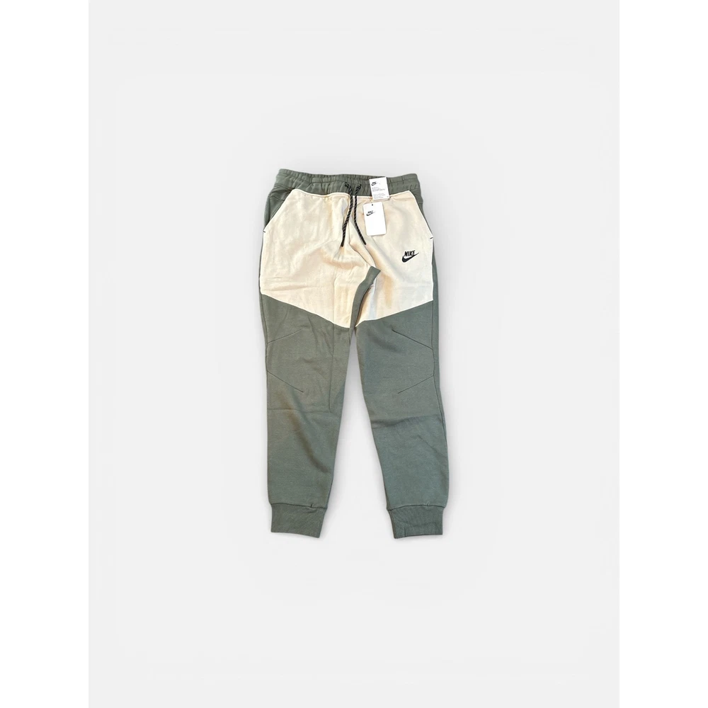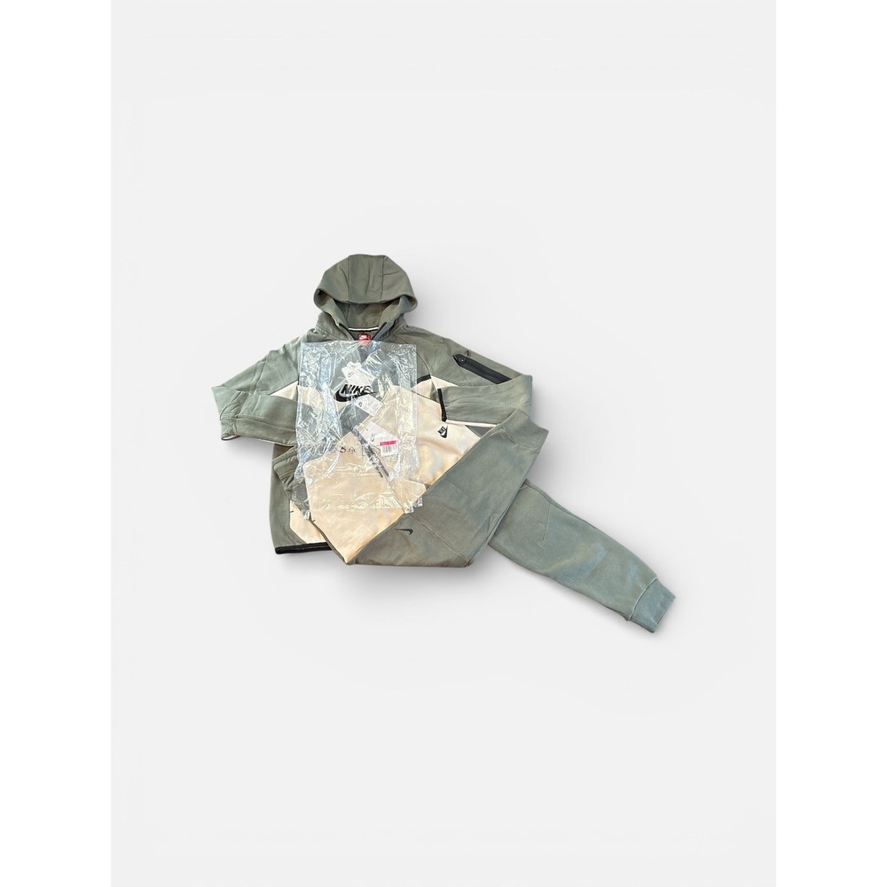 Nike Tech Fleece tracksuit full set in a two-tone olive green and cream colorway offers a modern athletic aesthetic with premium lightweight warmth. The full-zip hoodie features a high neck, chevron chest design, and a zippered sleeve pocket, while the matching joggers include an elastic waistband with drawstrings and tapered cuffs for a streamlined fit. Signature Nike Futura logos appear on both pieces, making this a versatile choice for streetwear or active recovery.