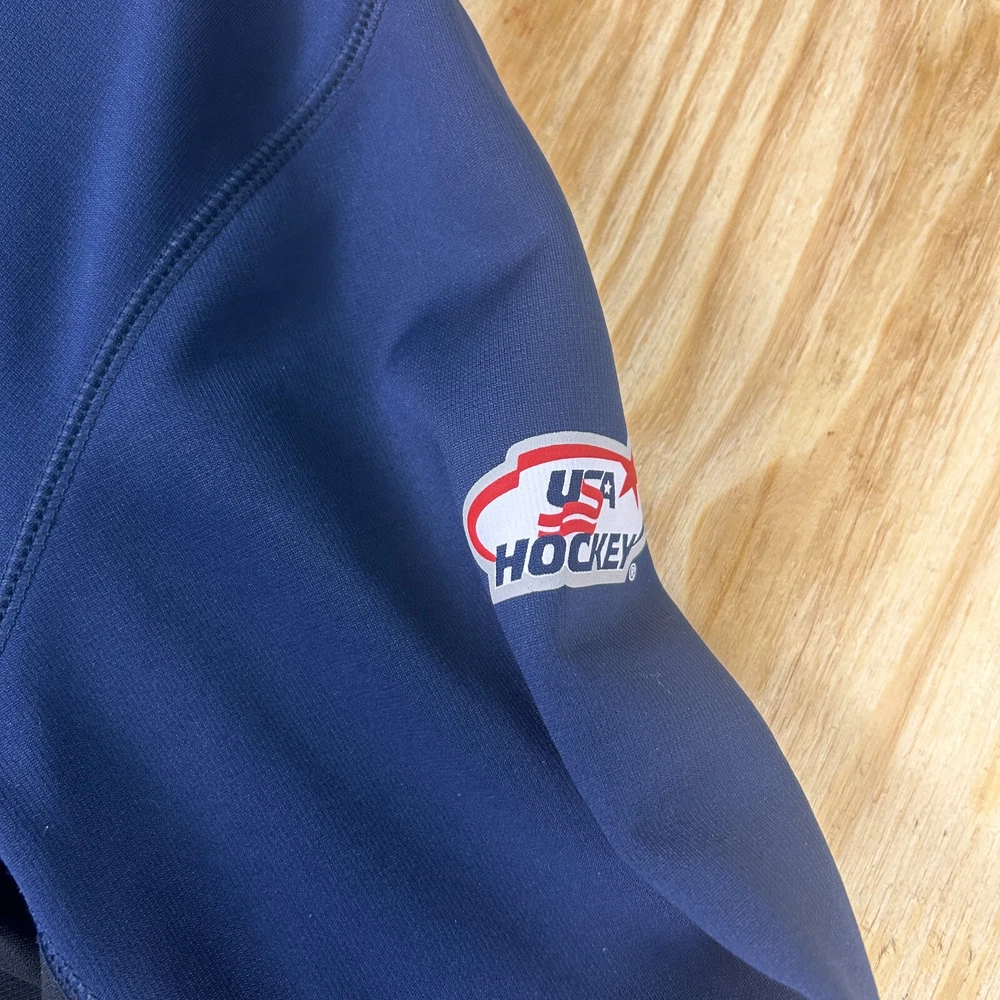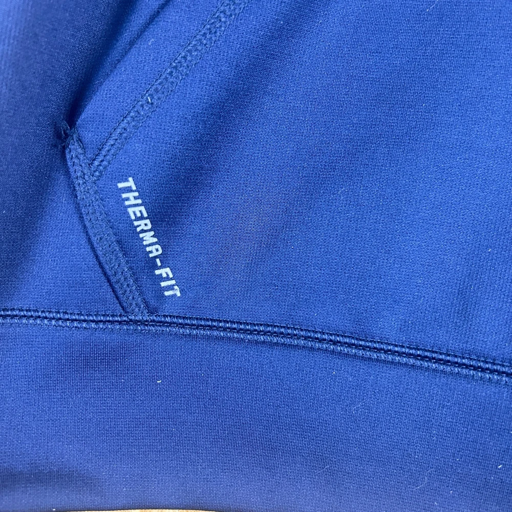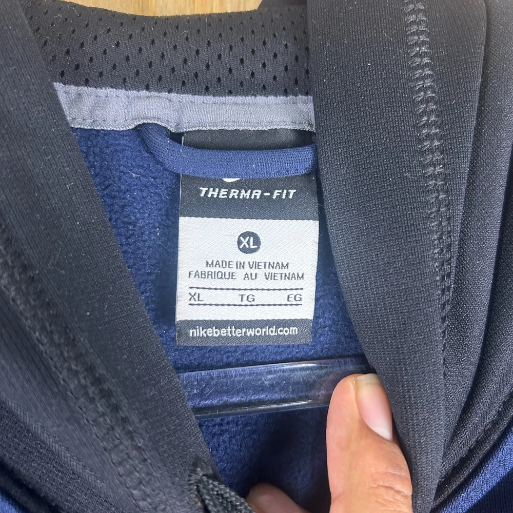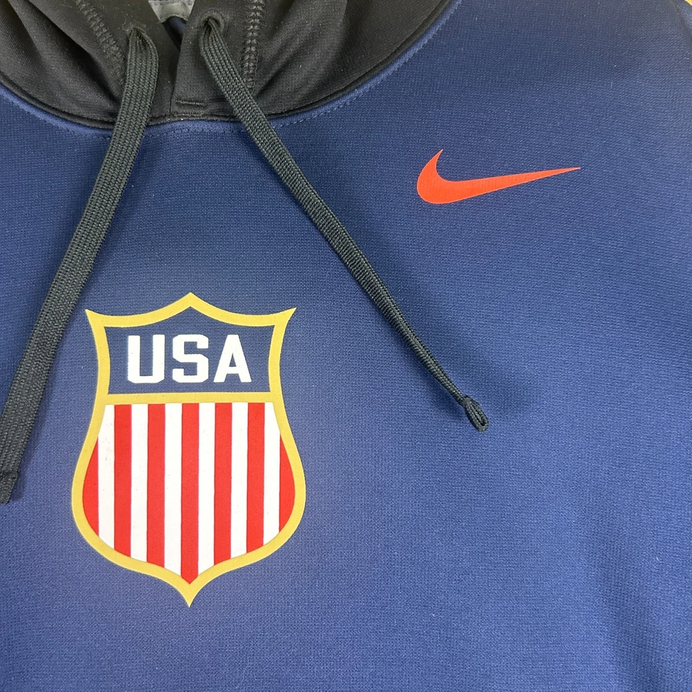 Show your support for Team USA with this Nike Therma-Fit hoodie jacket. Made from a soft and cozy fleece material, this pullover hoodie features a drawstring closure and long sleeves for a comfortable fit. The hoodie also includes pockets for added convenience. The black hoodie features the iconic Nike 'Snike' logo and a solid USA theme, making it the perfect addition to any 90s-inspired outfit. It's machine washable and available in a men's XL size. Whether you're hitting the basketball court or running errands, this Nike Sportswear hoodie is a must-have. SKU: 280007