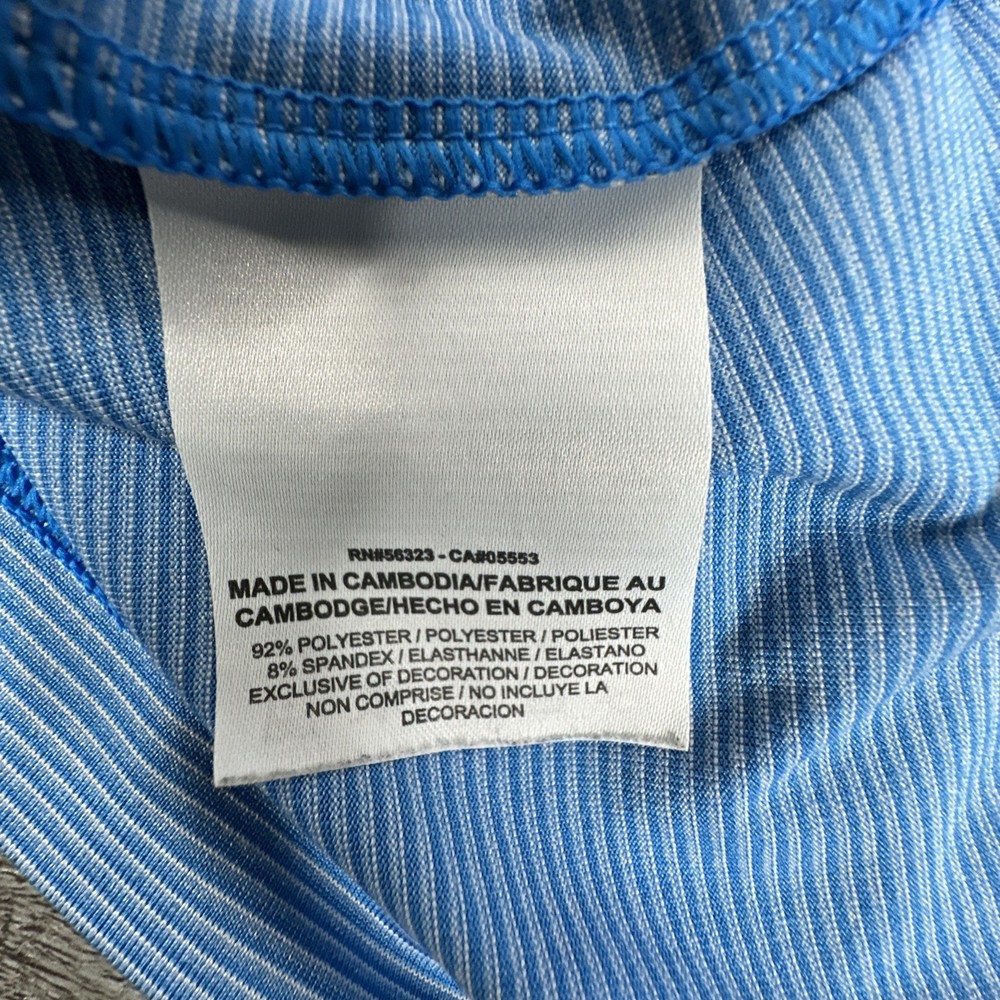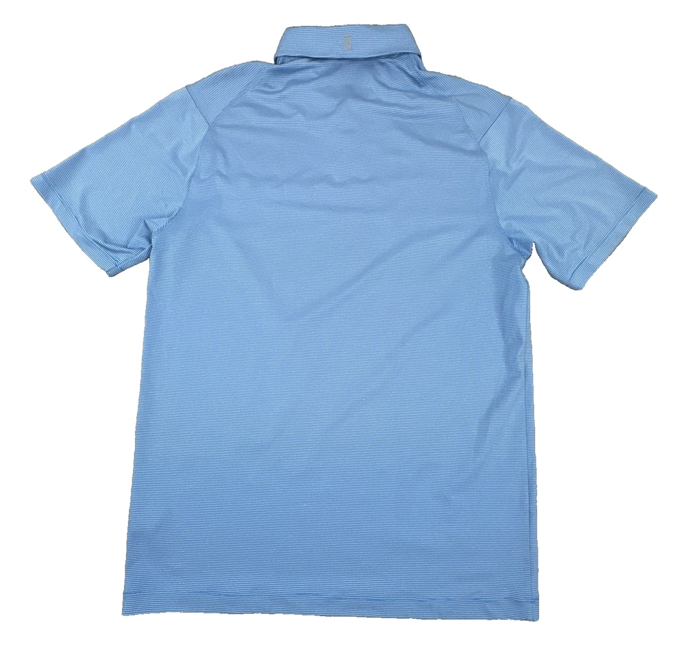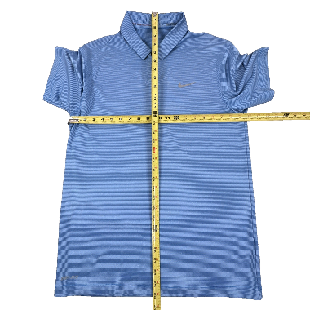 The Nike Tiger Woods Collection Men's Size S Blue Striped Dri-FIT Golf Polo Shirt is a stylish and functional piece of clothing designed specifically for golf enthusiasts. Made with a blended fabric that includes polyester, this polo shirt offers breathability and comfort during outdoor activities. The blue striped pattern and logo accents add a touch of sporty style, perfect for both casual wear and golfing in the warmer seasons. With a spread collar and button closure, this polo shirt provides a classic and clean look that is sure to impress both on and off the golf course.