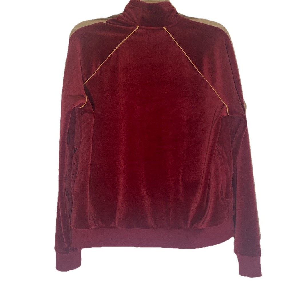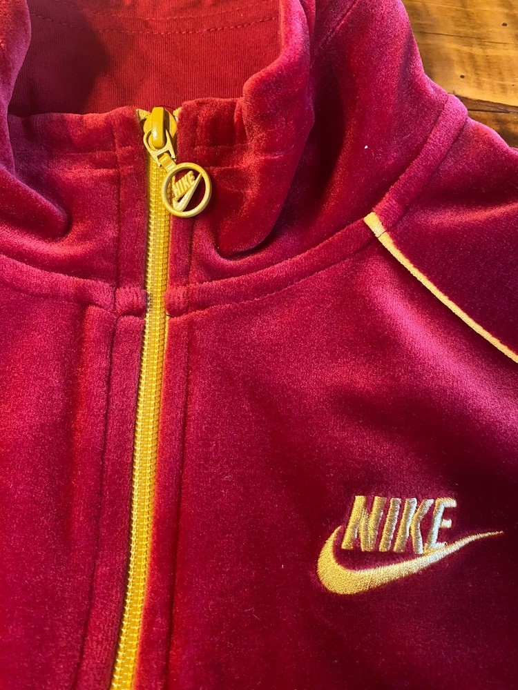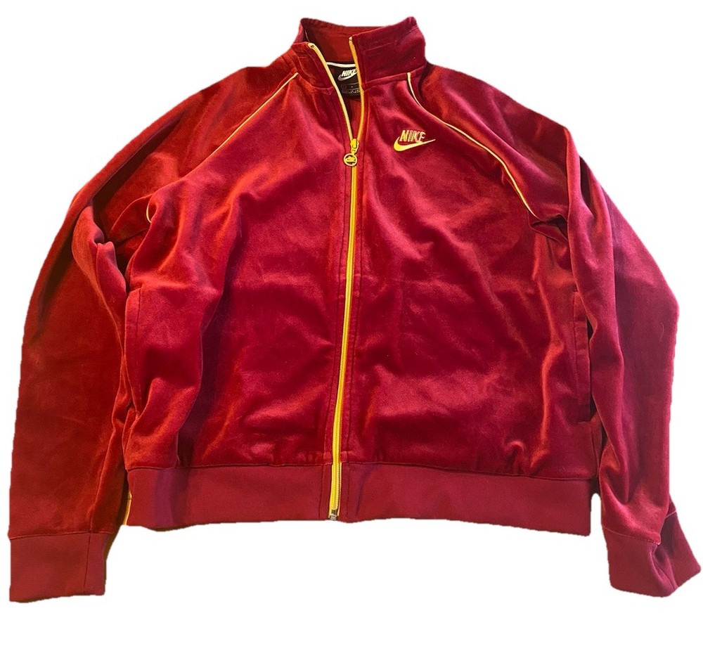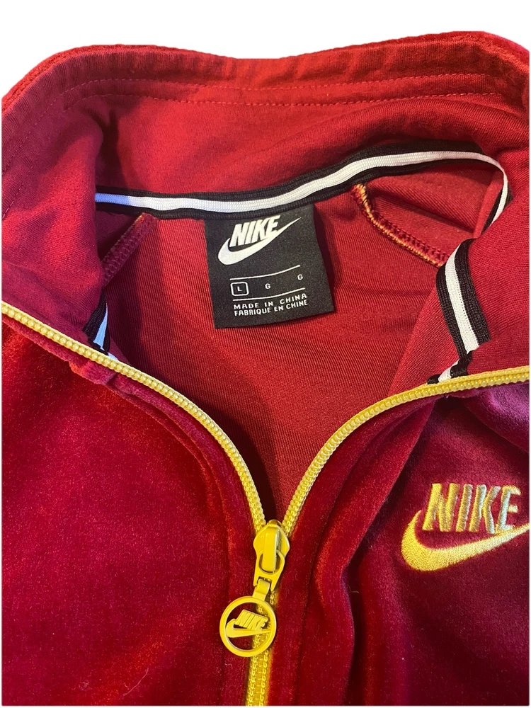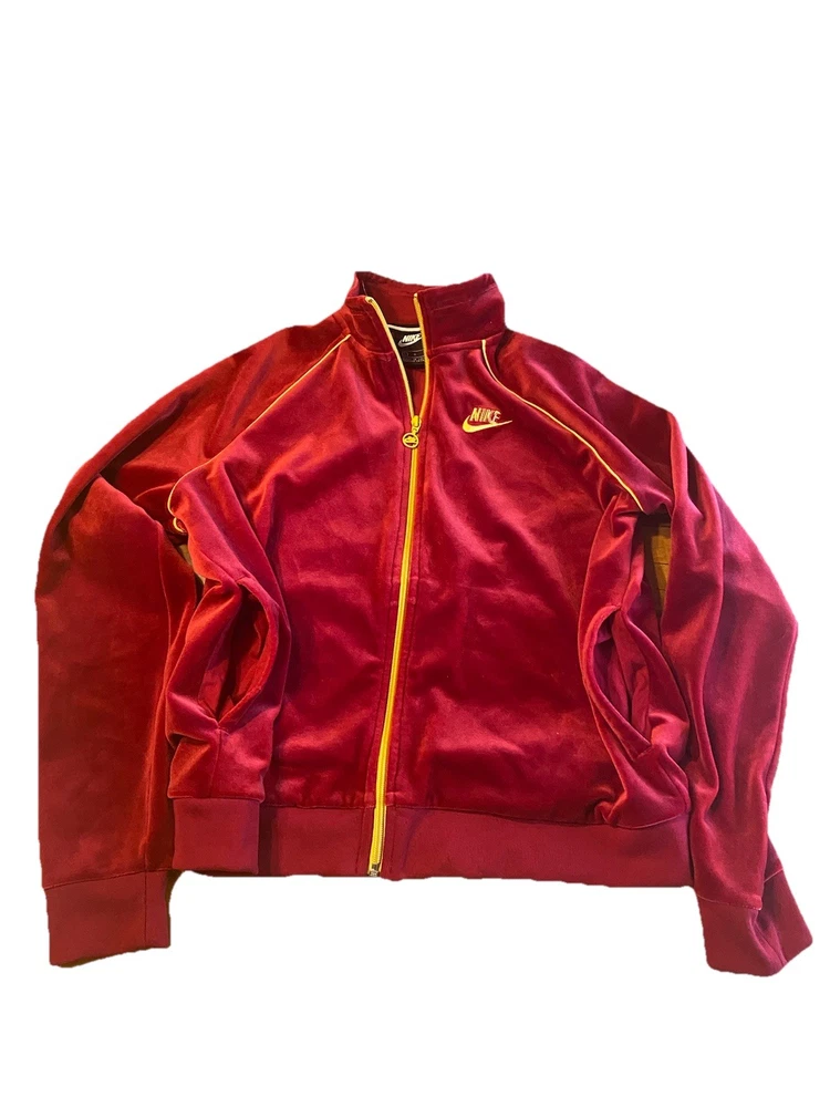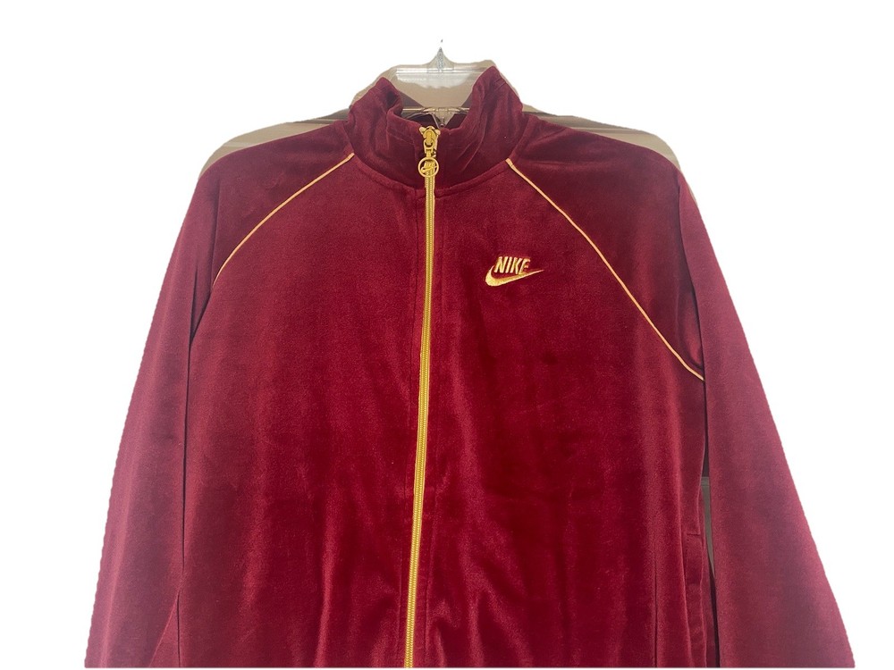 This Nike Track Jacket in women's size large is a stylish and versatile activewear piece. Made of polyester, this burgundy and gold velour jacket features a full zip closure and long sleeves, making it perfect for various activities such as cycling, dance, and basketball. With a regular fit and 24" length, this track jacket is machine washable and suitable for all seasons. Showcasing the iconic Nike brand, this jacket is a great addition to any athletic wardrobe. In good pre owned condition ( i-3)