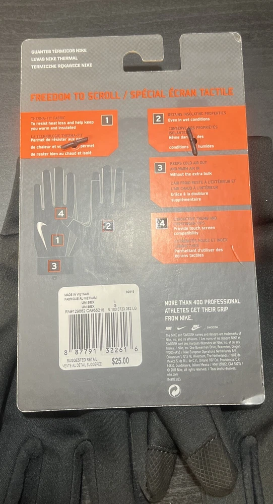Stay warm and stylish with these Nike Unisex Thermal Be Warm Touch Screen Running Gloves. These gloves are perfect for outdoor activities such as walking and running during the winter and fall seasons. The black reflective design adds a touch of style to your activewear or casual look. Made with polyester material, these gloves are lightweight and comfortable. They also feature touchscreen compatibility, allowing you to use your phone without having to take off your gloves. With a warm glove warmth, your hands will stay cozy and comfortable throughout your outdoor activities. Get ready to tackle the elements and stay warm with these Nike running gloves.