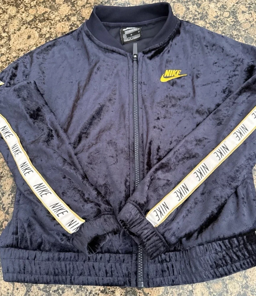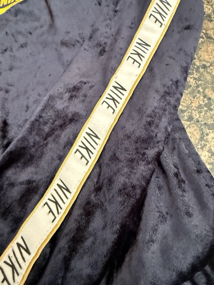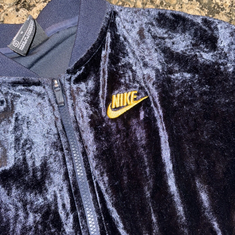 Nike Velour VTG Y2K 80s Style Velour Women’s Medium (fitted, Small) Tracksuit Navy blue (not black!) This is a fitted women’s/juniors size. Sized Medium (will fit an XS or S sized women depending on style wanted) Stretch, soft velour Striped sleeve with sewn ribbon and gold accent Elastic waist can allow for a short look if wanted