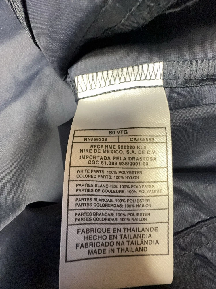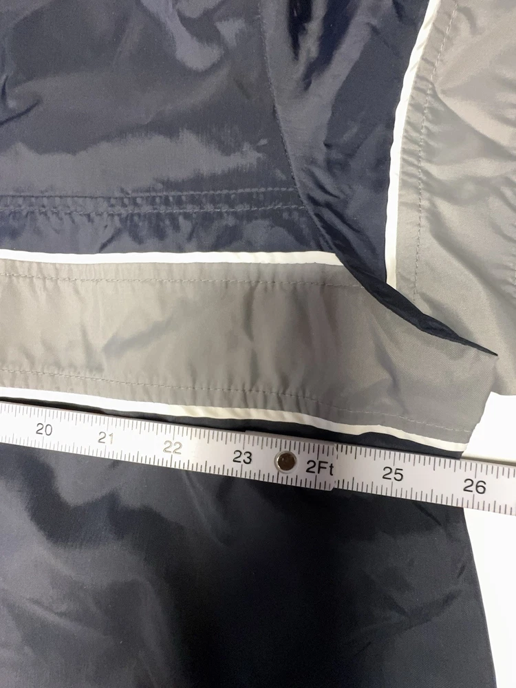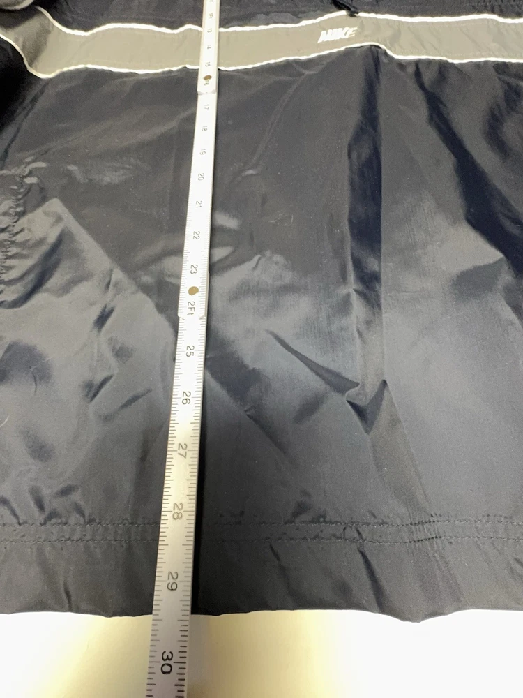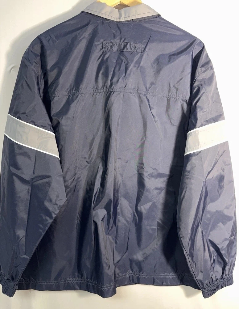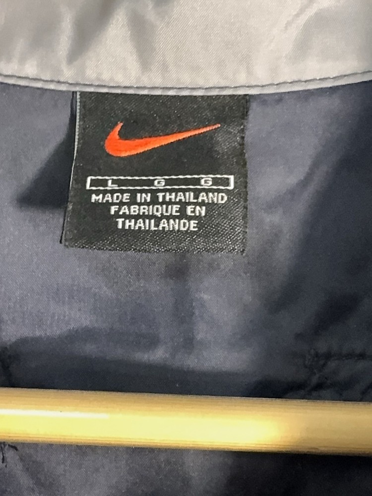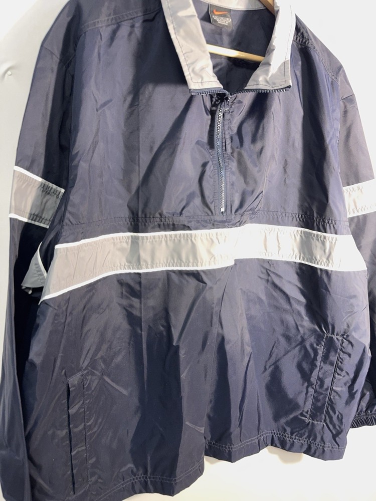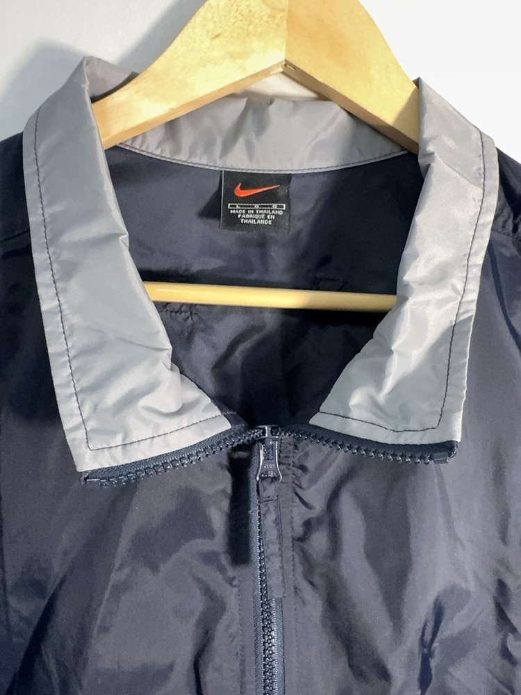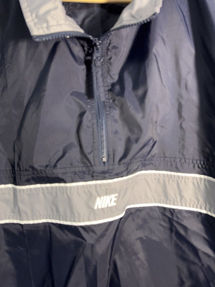 Vintage Nike half-zip anorak windbreaker jacket in classic navy blue with gray contrast panels and embroidered chest logo. Features a lightweight nylon shell, stand collar, elastic cuffs, and a relaxed athletic fit. Made in Thailand with early Nike tag styling, consistent with late 1990s to early 2000s production. Easy throw-on layer for casual wear, training, or retro streetwear looks. Condition: very good vintage condition with no holes or major flaws noted.