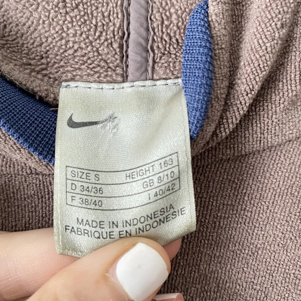 Nike Woman’s Brown French Terry Cloth Navy Accent Active Hoodie Sweatshirt Small Pullover style Drawstring cord waist Navy blue sleeve collar and hood accents Brim on hoodie Zip pockets No stains Small pull on collar Small rip on wrist logo Comes from a smoke free pet free house Size small measures 19.5” pit to pit and 22” in length laying flat