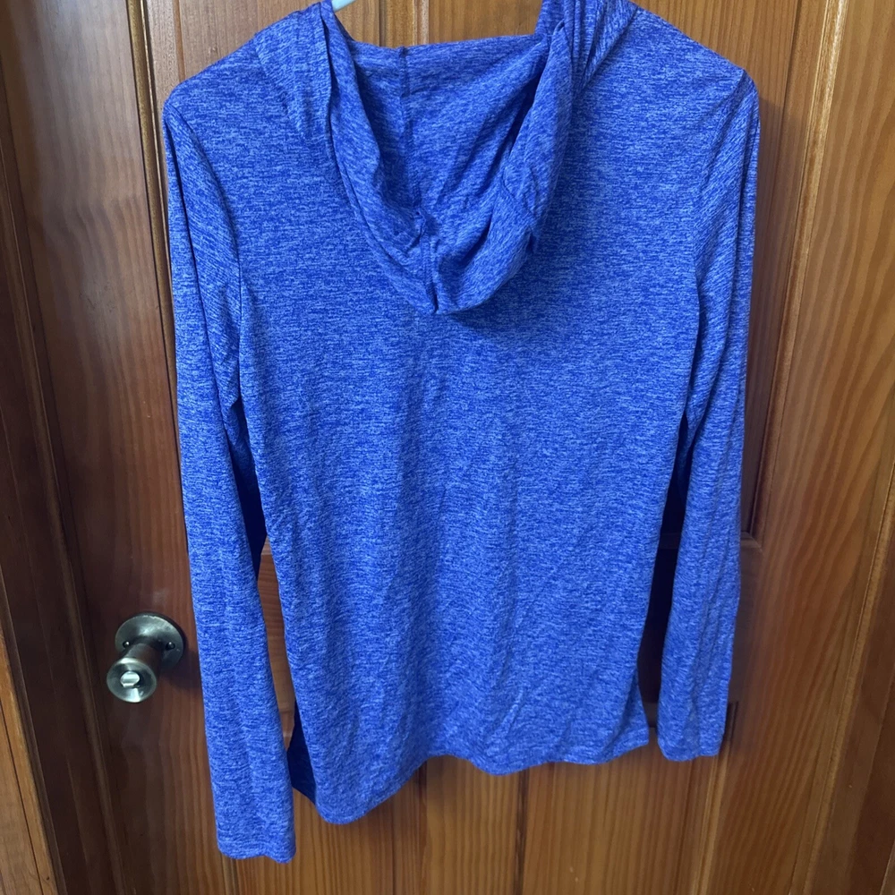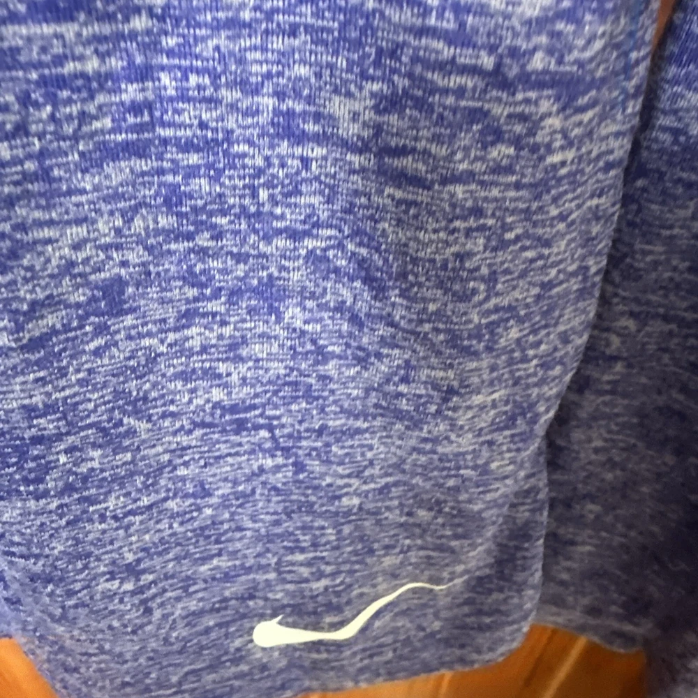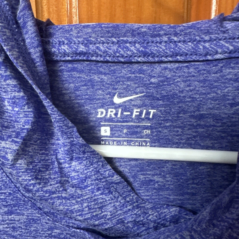 This is a Nike women's training T-shirt in heathered purple, featuring long sleeves with a hood for a lightweight feel. It has a V-neckline and pullover closure, suitable for activewear such as gym training, cross-training, and running. The T-shirt is part of the Nike Dri-FIT product line, designed for performance with moisture-wicking capabilities.