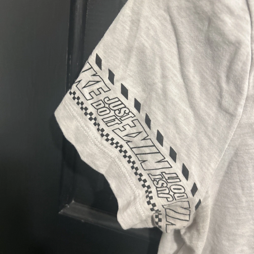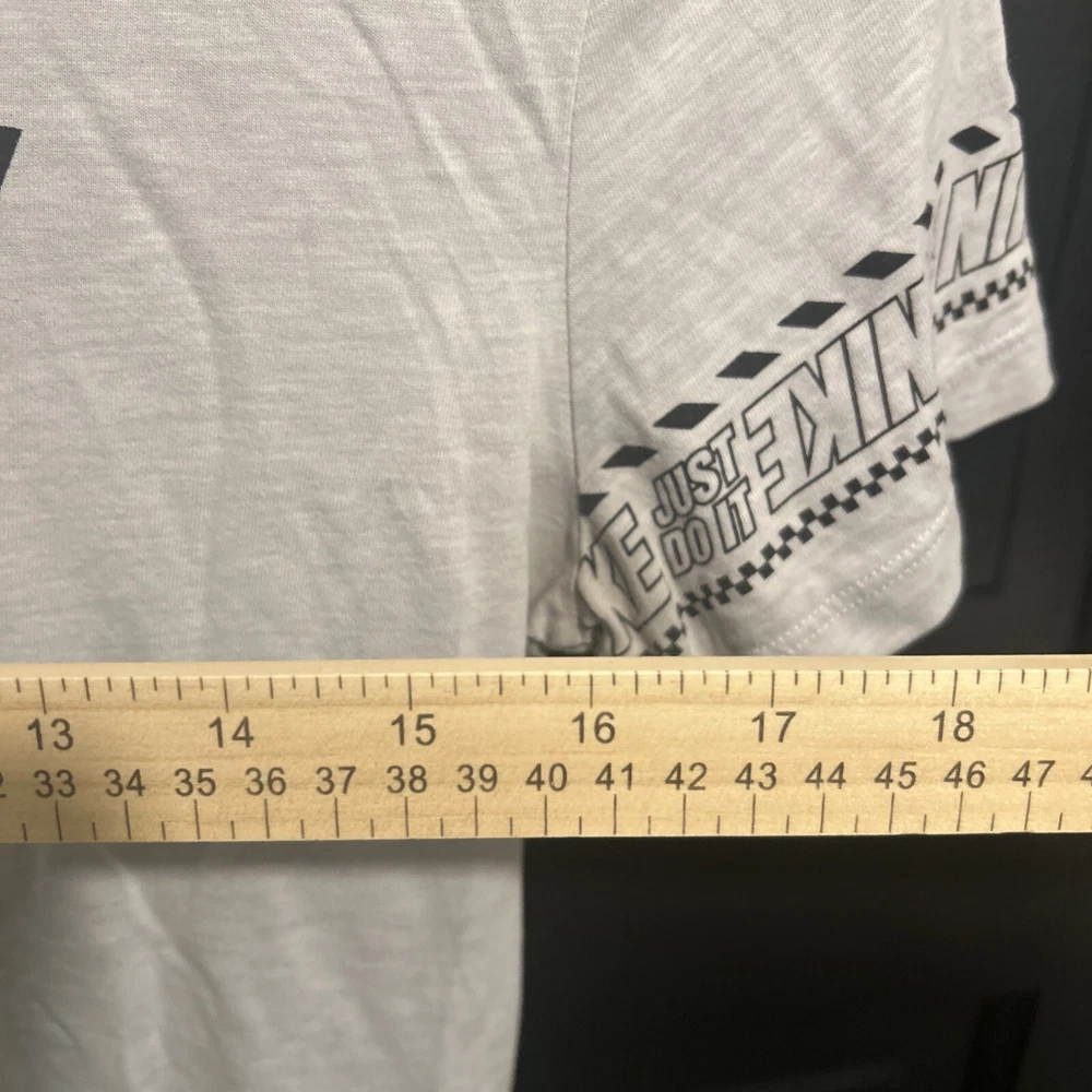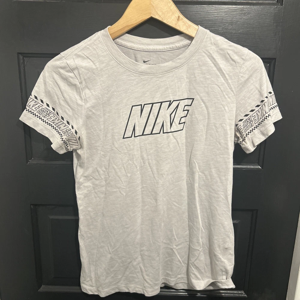 This Nike Women's T-Shirt is perfect for any active occasion. The Dri-Fit technology ensures you stay comfortable and dry, while the gray color with logo on sleeves adds a touch of style. Available in size S, this regular fit shirt is ideal for activewear. The shirt is part of the Clothing, Shoes & Accessories, Women, Women's Clothing, Activewear, and Activewear Tops categories. Add it to your wardrobe and enjoy the quality and comfort of Nike.