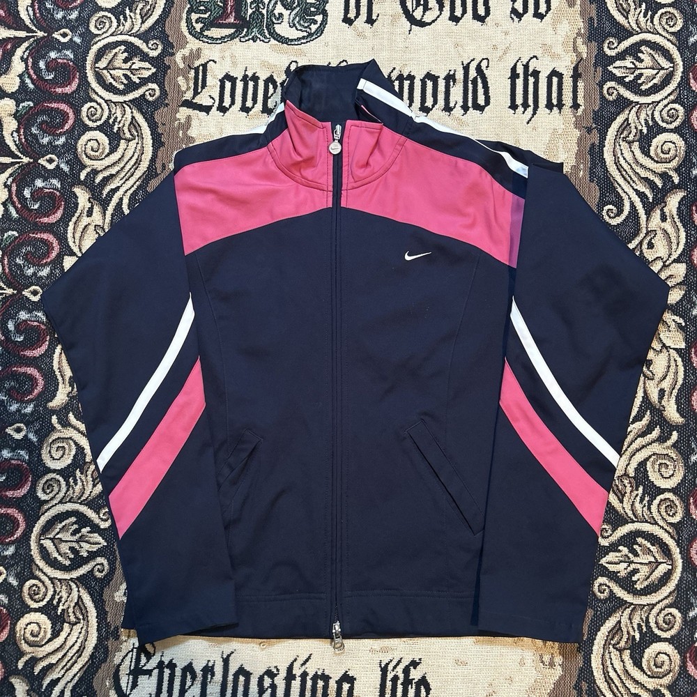 Nike Women's Navy Blue and Pink Full Zip Track Jacket Size M (8-10)