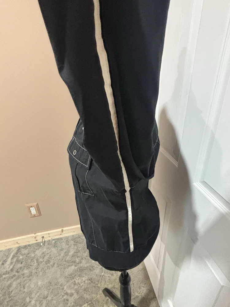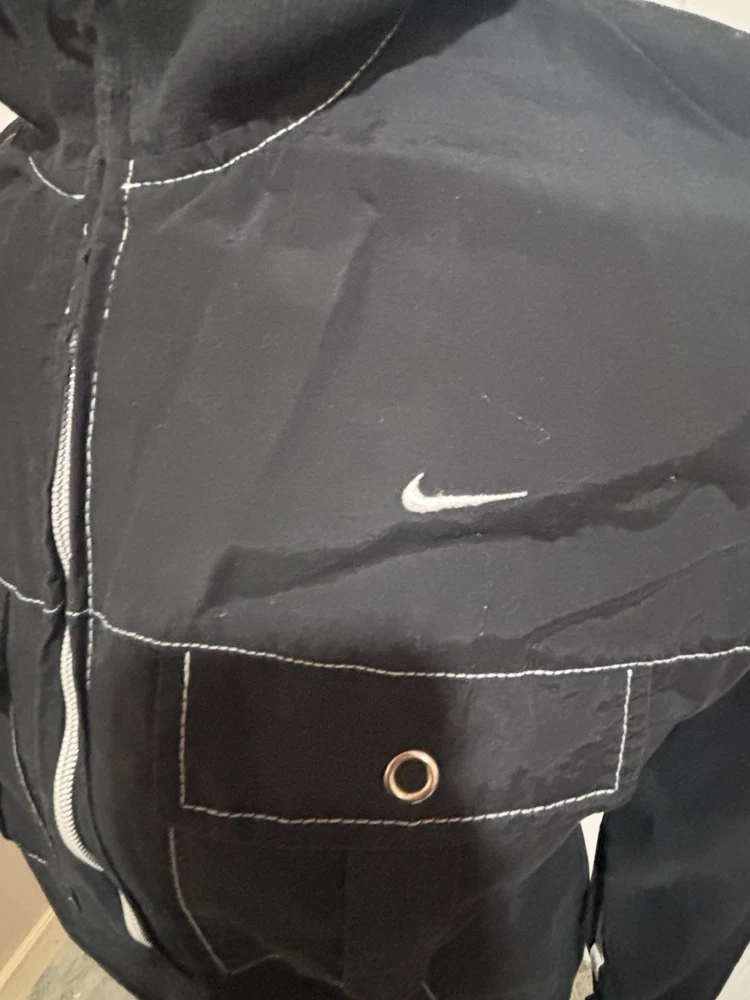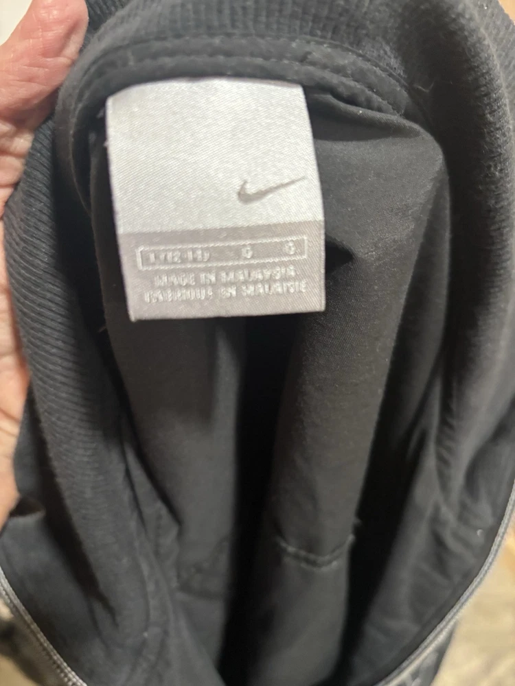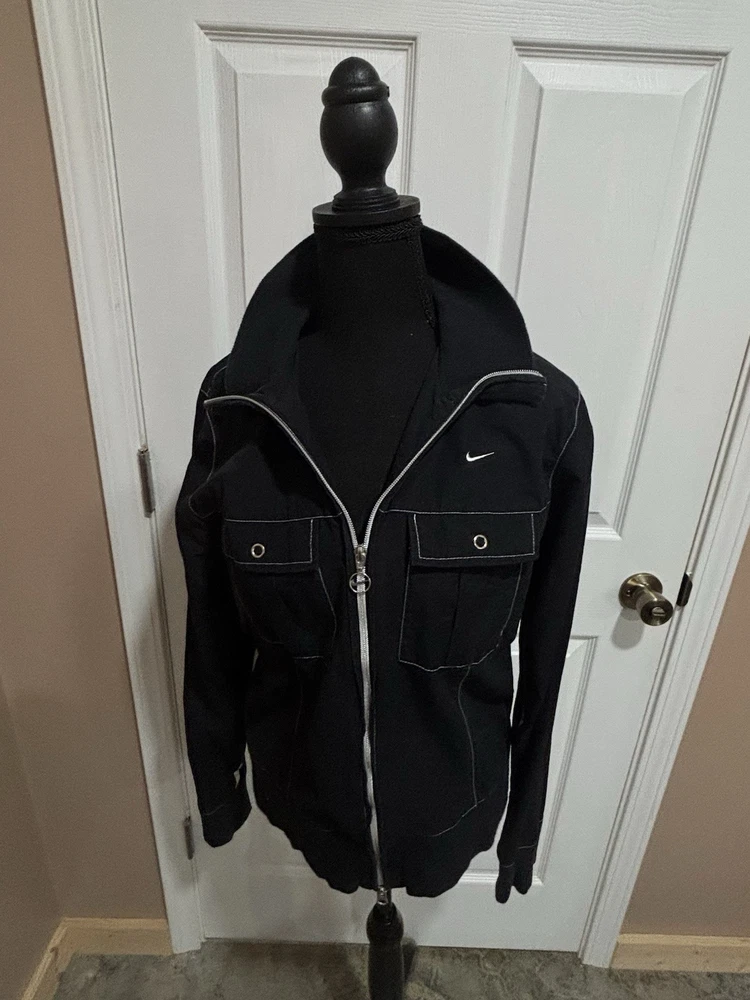 This Nike Women's Vintage Y2K Black Zipper Logo Jacket is a must-have for any activewear collection. The jacket is made of high-quality polyester material and features a full zip closure, long sleeves, and a mid-length jacket/coat length. The black and white color combination, along with the Nike swoosh character, creates a stylish and classic look that can be worn during any season. The jacket is machine washable and has been well-maintained, ensuring its quality and durability. It is perfect for walking, running, and jogging, making it an ideal choice for those who enjoy outdoor activities. The jacket's features include a solid pattern, polyester lining material, and insulation material, making it both comfortable and functional. The jacket is a size L and fits regular, making it a versatile addition to any wardrobe.