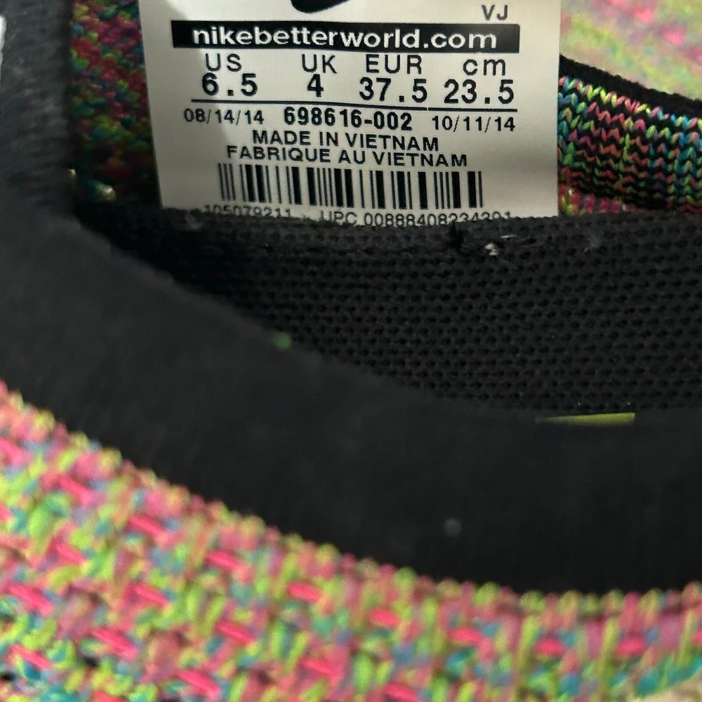 UPC: Does not apply Product Line: Nike Zoom Customized: No EU Shoe Size: 37.5 Release Year: 2014 Style Code: 698616-002 Vintage: No Signed: No gtin13: Does not apply Brand: Nike US Shoe Size: 6.5 Model: Nike Flyknit Zoom Type: Athletic Style: Sneaker Color: Multicolor Department: Women