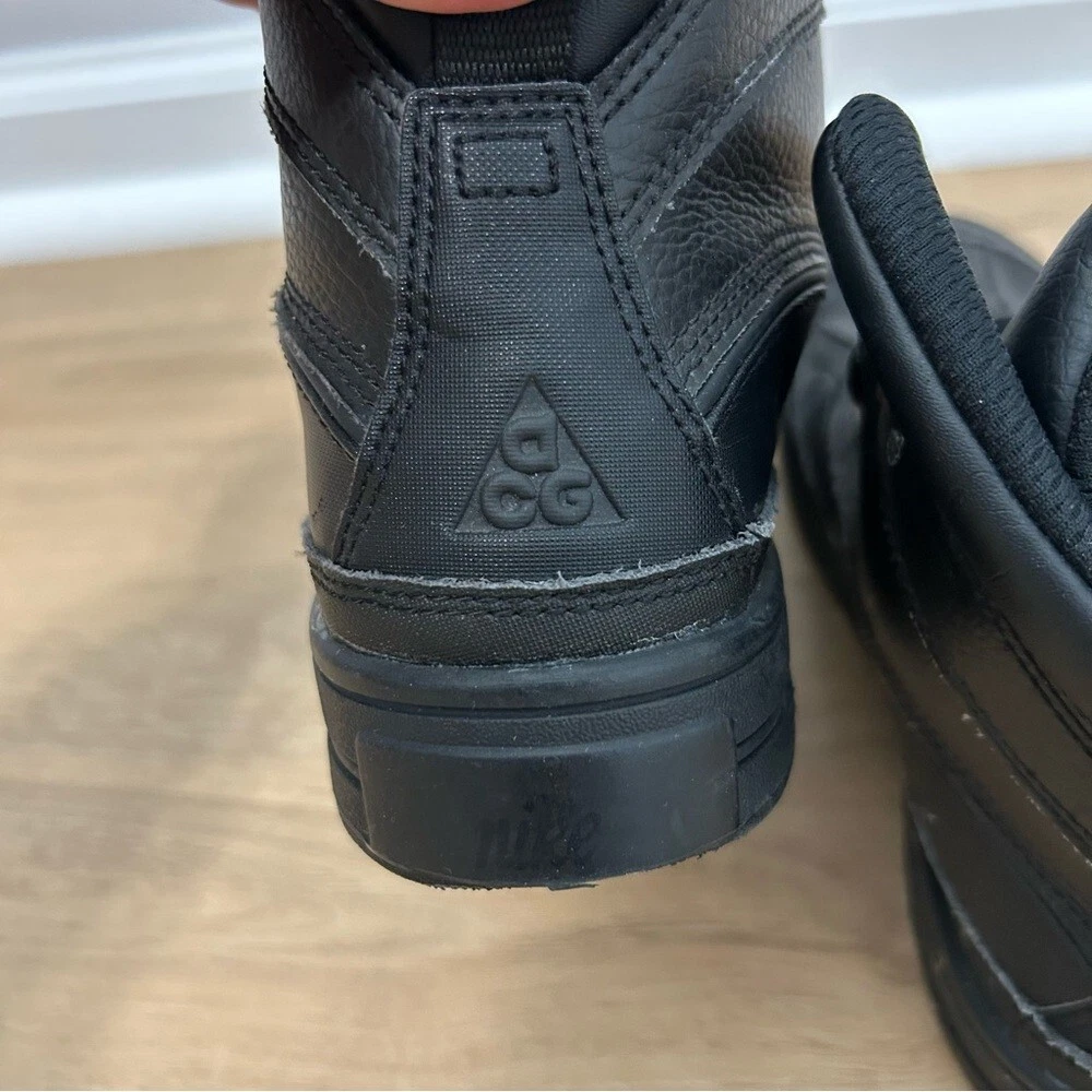 These Nike black boots feature a high ankle design, providing excellent support and a sleek, monochromatic look. Crafted with a textured upper, they offer both style and durability. The sturdy sole ensures comfort and stability, making them perfect for various activities.