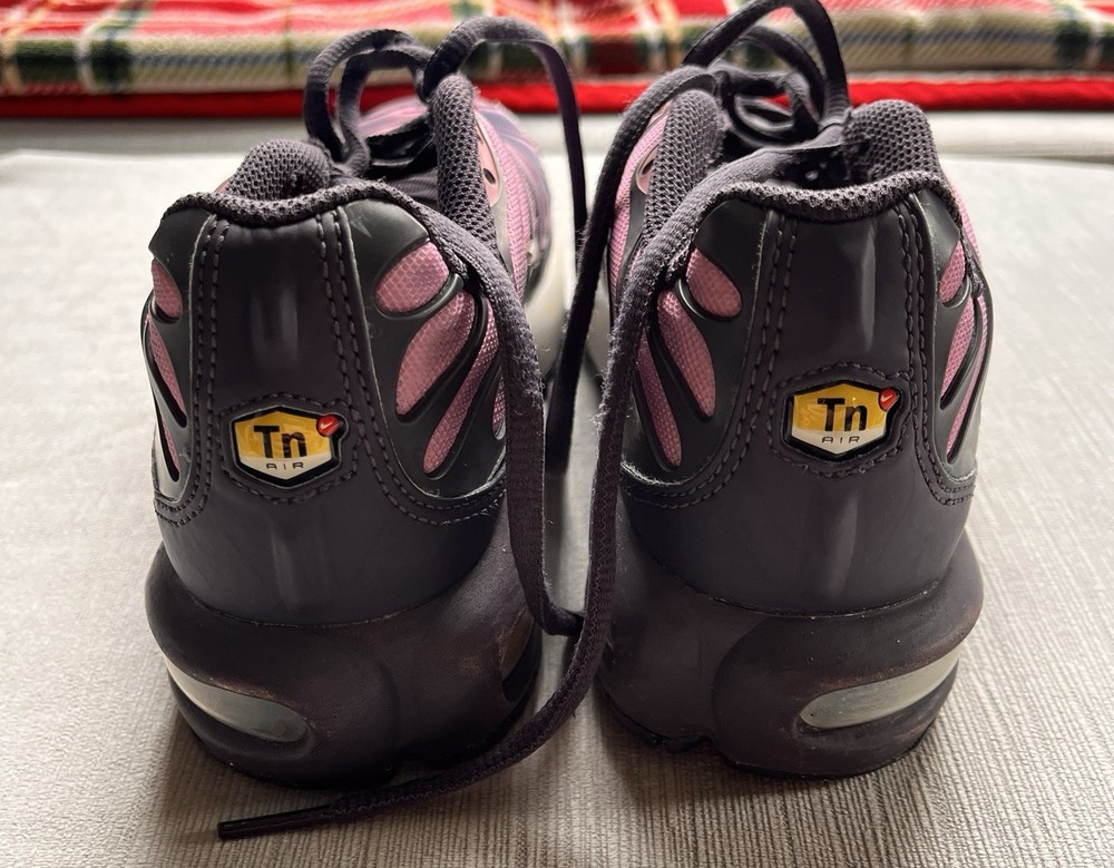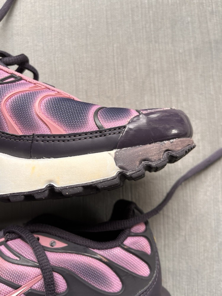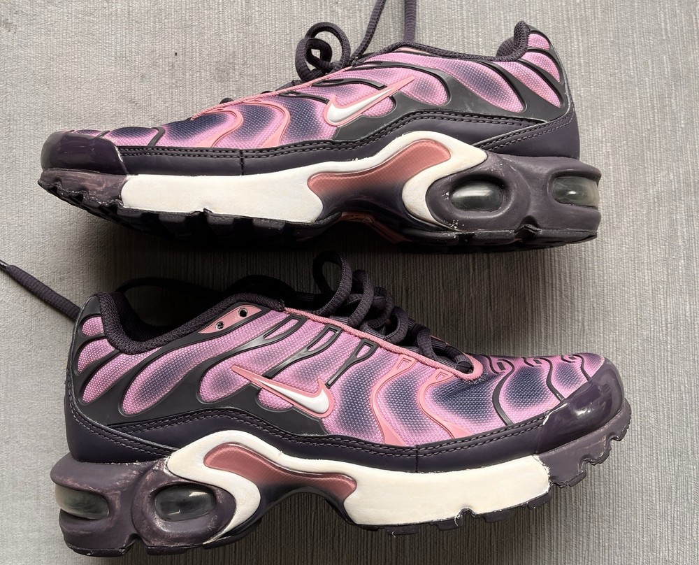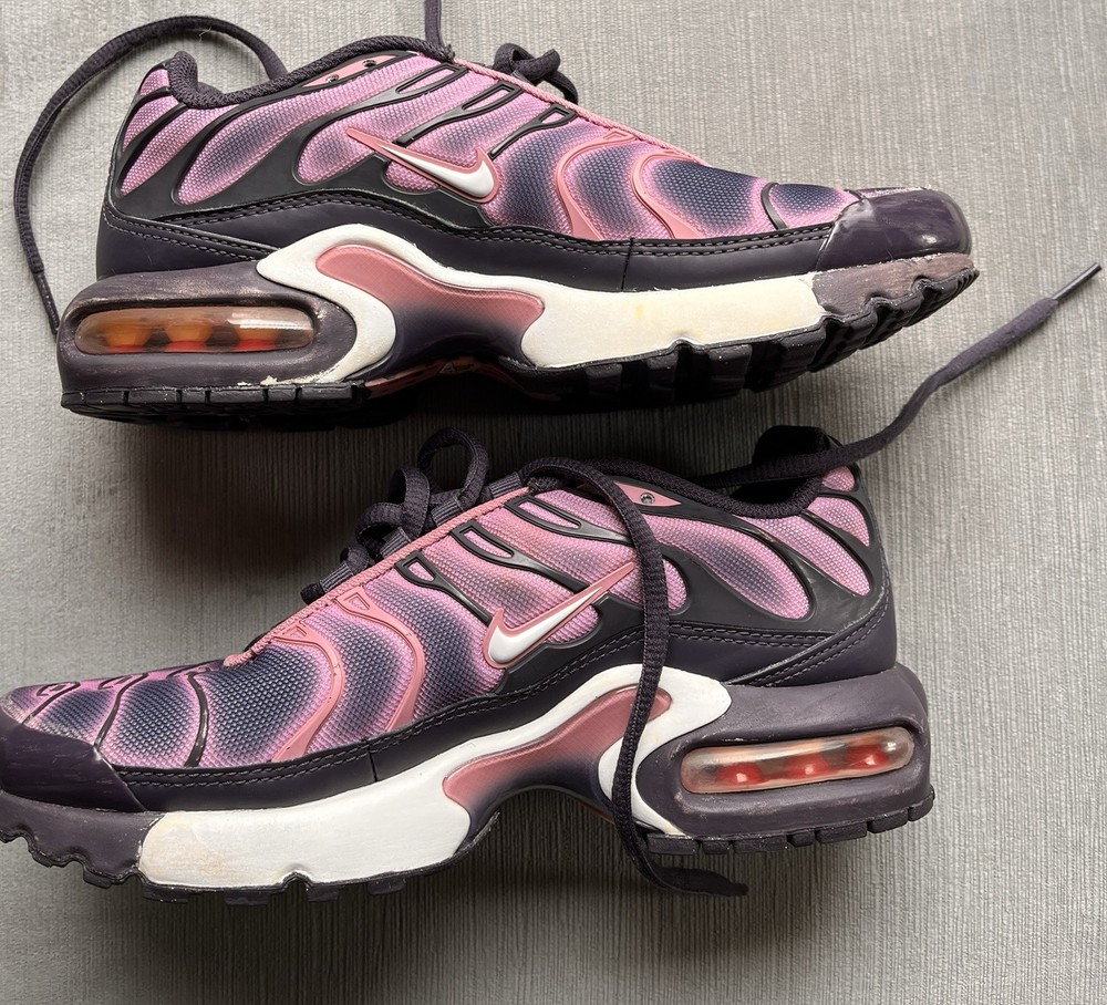 The product is a pair of Nike Youth Air Max Plus TN GS running shoes in a stylish pink and purple color combination. These casual shoes are designed for unisex kids and feature a comfortable fit with a 4.5 US shoe size. Made with 100% silk upper material, these shoes are part of the Air Max product line and are perfect for everyday casual wear. There is minor scuffs but shoe is still in great condition.