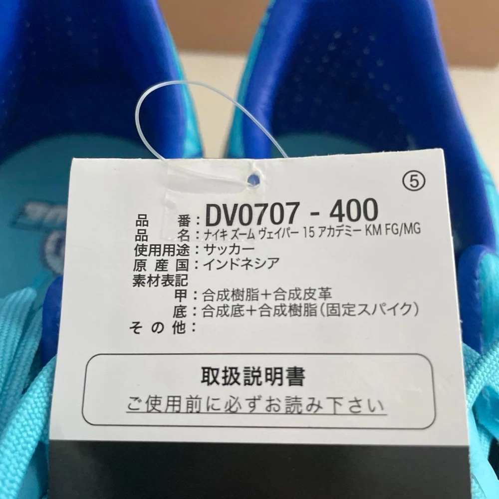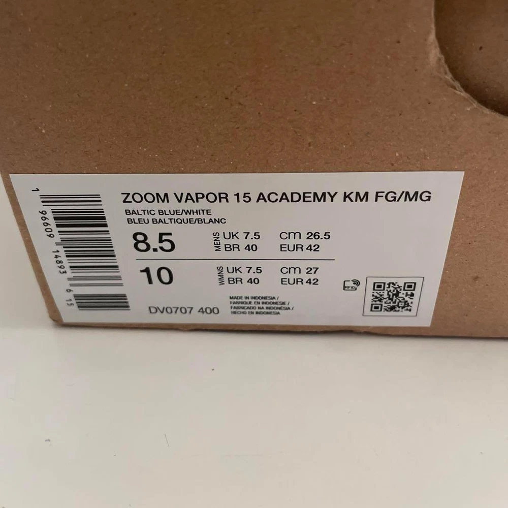 Nike Zoom Vapor 15 DV0707 Soccer Cleats US 8.5 Mbappé Signature Blue Key Features **Nike Zoom Vapor 15 Academy Soccer Cleats - Size US 8.5 (26.5cm)** Elevate your game with the Nike Zoom Vapor 15 Academy soccer cleats, designed for speed and comfort. Part of the Kylian Mbappé Signature Collection, these cleats feature: - **Color**: Blue - **Model**: DV0707 - **Type**: FG/MG (Firm Ground/Multiground) - **Upper Material**: Soft, flexible mesh with NikeSkin coating for enhanced ball control - **Zoom Air Unit**: Integrated in the heel for responsive cushioning - **Traction**: Unique traction pattern for superior grip and quick acceleration - **Fit**: Improved fit with a toe box that conforms to foot shape **Condition**: Brand new, never used. Item Specifics: - C:Brand: Nike - C:Model: Zoom Vapor 15 Academy - C:US Size: Specifications Brand Nike Country Japan Sport Soccer Type Cleats Product Description Item Title 26.5Cm Nike Soccer Spikes Zoom Vapor 15 Dv0707 Payment Supports managed payments Please pay within 5 days after auction is finished. About Us We are located in Japan. It's our pleasure to make you happy by proposing our recommend item. If you have any questions or request about items, please feel free to ask us. International Buyers - Please Note: -Import duties, taxes, and charges are not included in the item price or shipping charges. These charges are the buyer's responsibility. -Please check with your country's customs office to determine what these additional costs will be prior to bidding/buying. -These charges are normally collected by the delivering freight (shipping) company or when you pick the item up - do not confuse them for additional shipping charges. -We do not mark merchandise values below value or mark items as - gifts - The US and International government regulations prohibit such behavior. Thank you for your understanding.