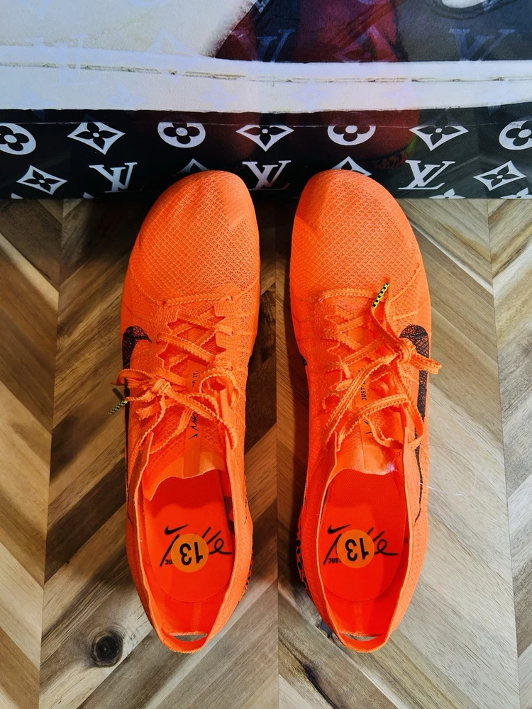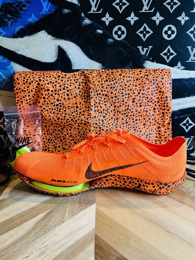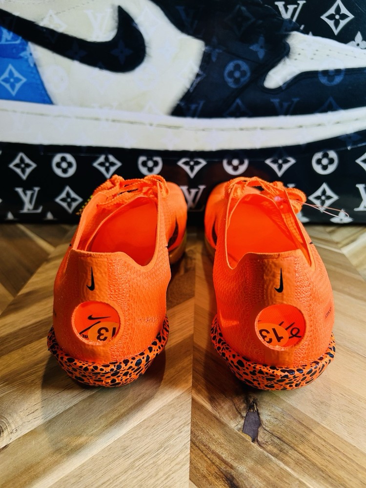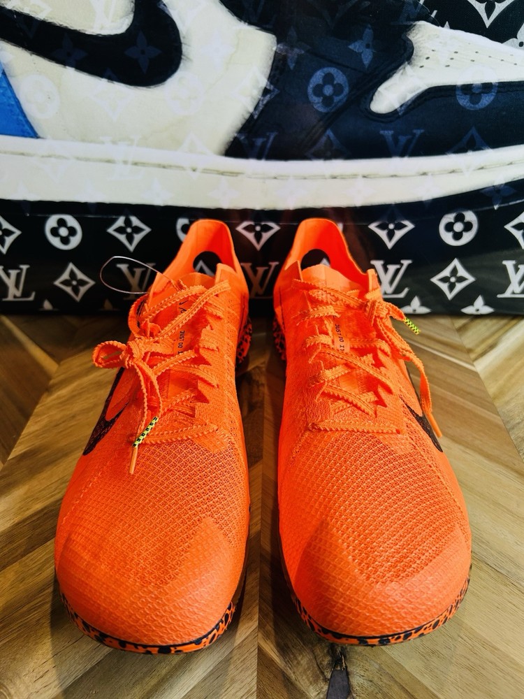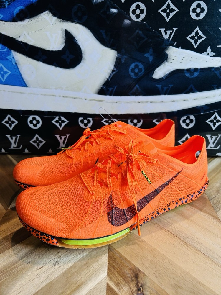 This is a pair of Nike ZoomX Victory 2 track spikes in a vibrant orange color, featuring spikes for track and field events. The shoes have a low top design with mesh upper material, a standard shoe width, and are designed for men in size 12 UK, 13 US, and 47.5 EU. The style code is FV2325-900, and they are part of the Nike ZoomX product line, with a release year of 2024.