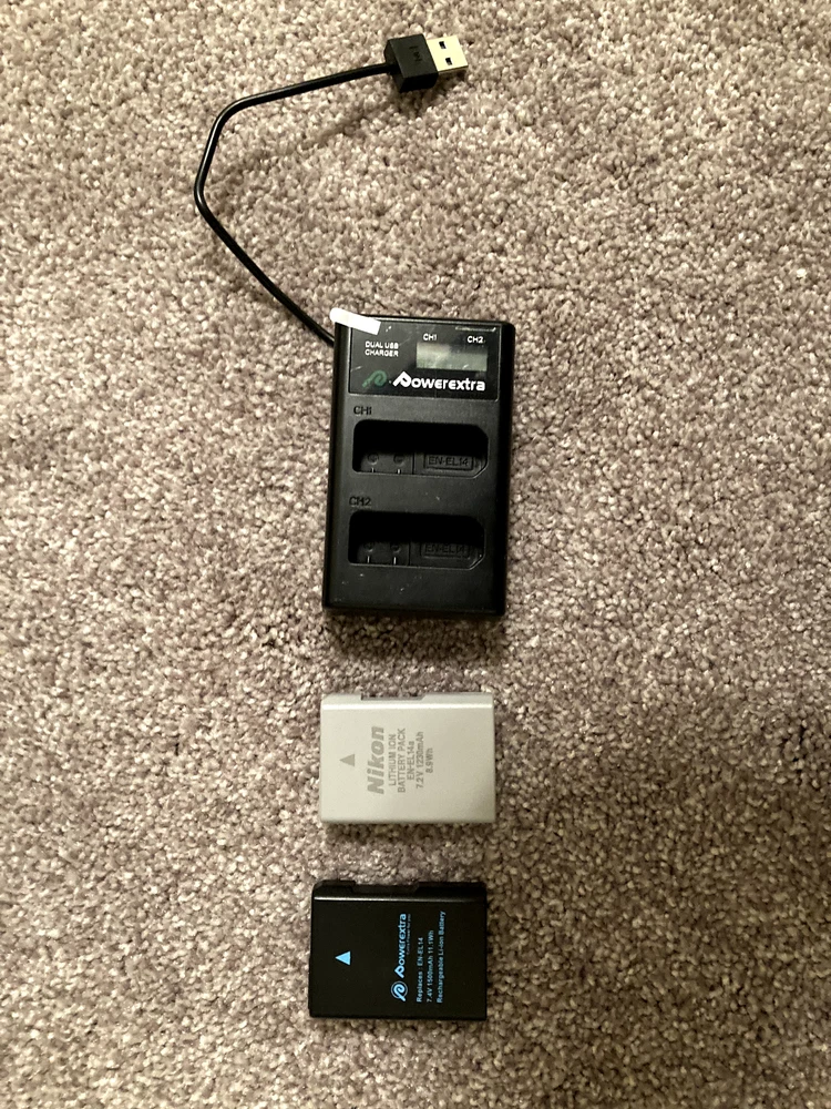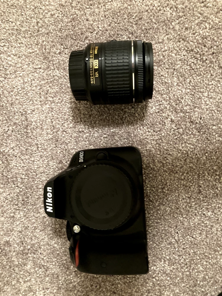 Nikon D3400 with 18-55mm Lens, missing lens cap, purple filter on end protecting lens, with two batteries and charger.