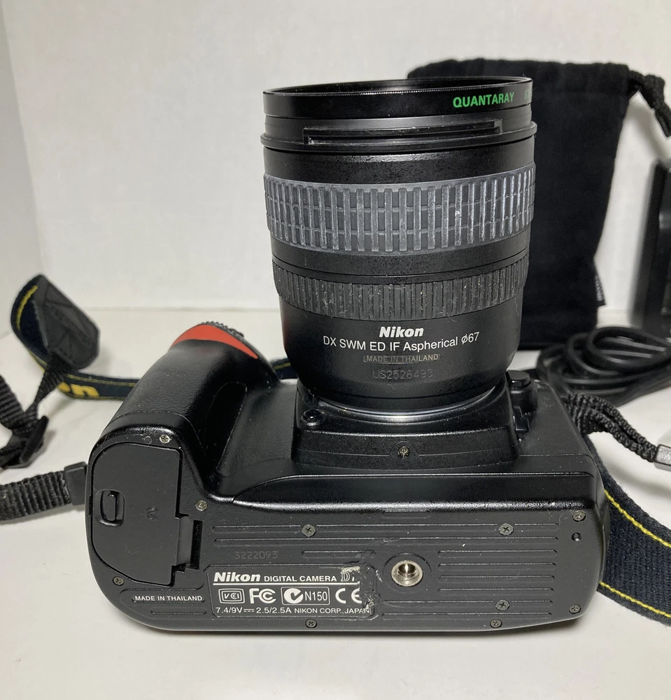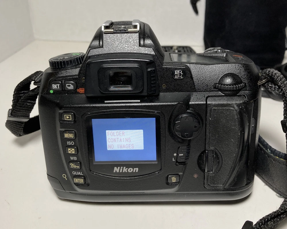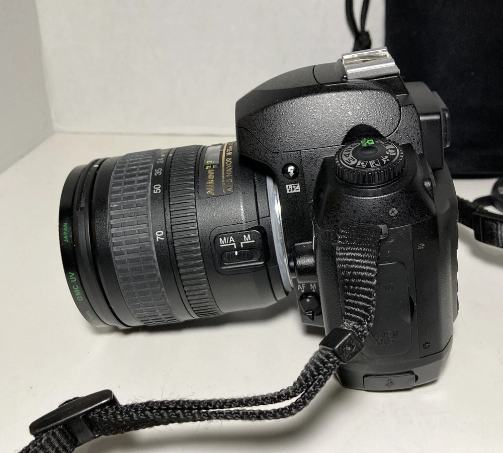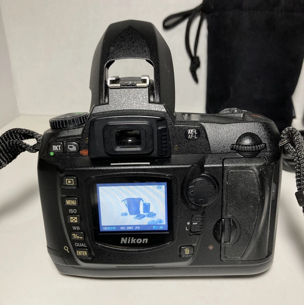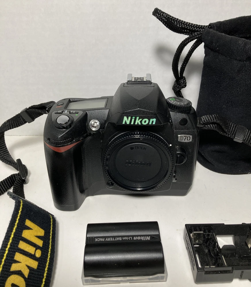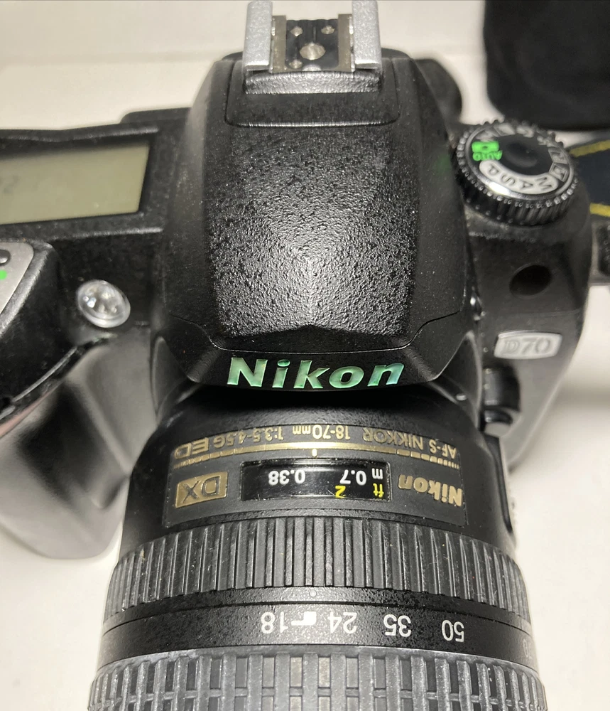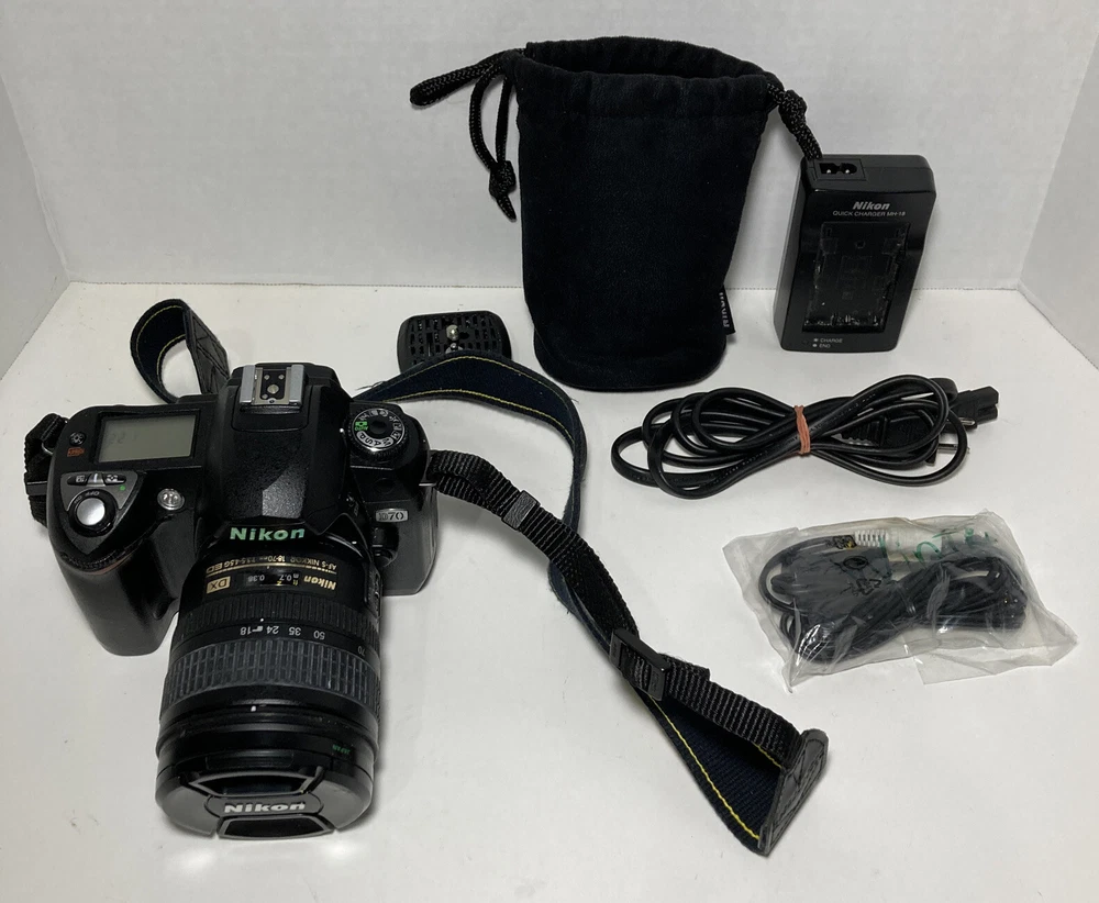 This Nikon D70 DSLR camera comes with an AF-S DX 18-70mm lens and has been tested to ensure proper functionality. It has a maximum resolution of 6.1 MP and features auto-focus capabilities for easy use. The camera is black in color and uses a lithium-ion battery for power. The Nikon D70 is part of the Nikon D series and weighs 21.2 oz. It includes USB connectivity for easy transfer of photos and is a great option for anyone in need of a reliable digital camera. The Nikon letters on the front of the camera have been colored in with a green marker. The camera includes everything pictured. The item will ship out safely and securely the same or next business day.