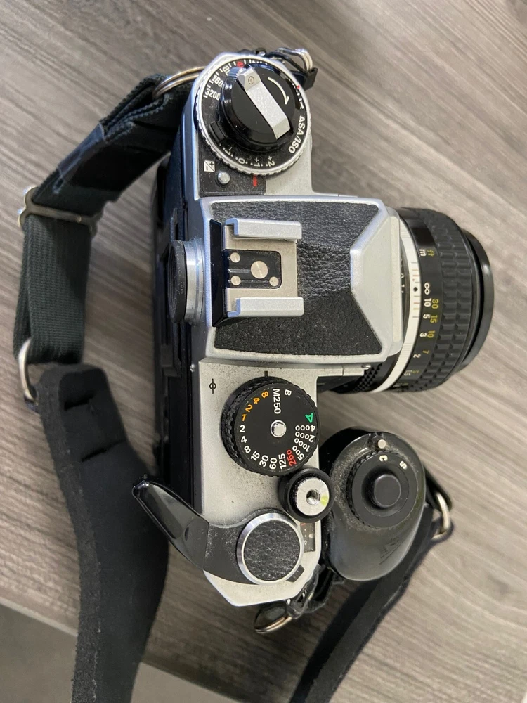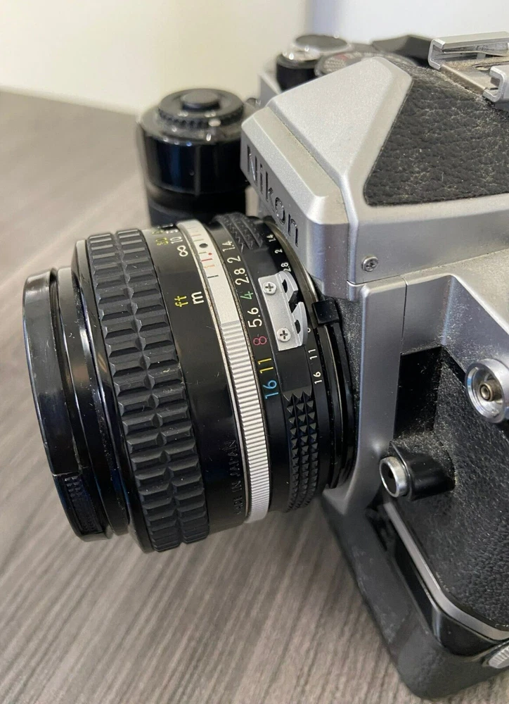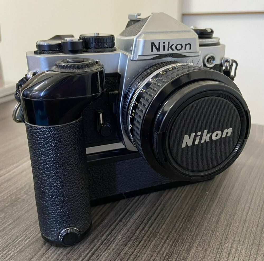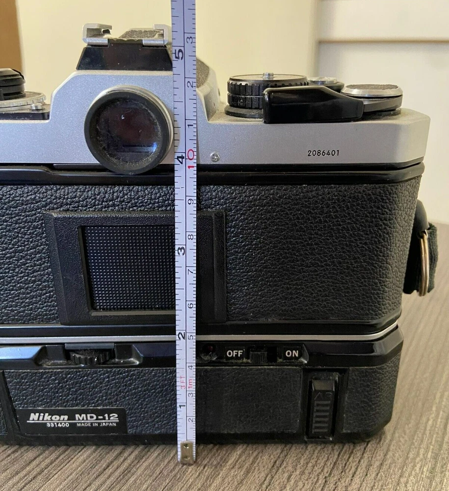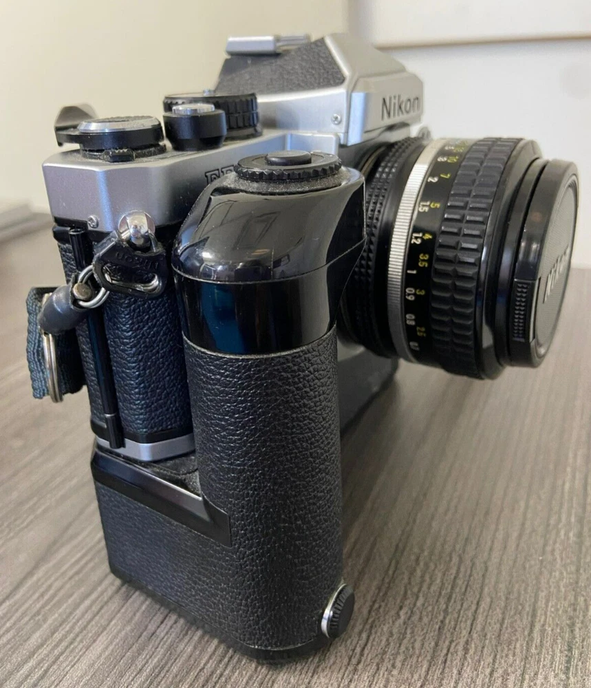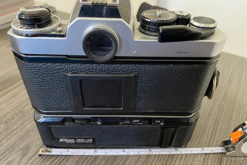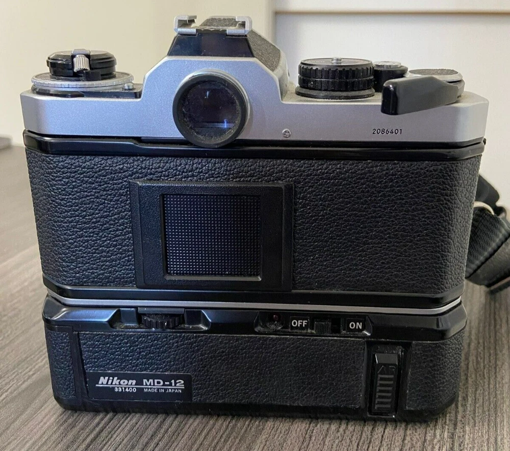 The product is a Nikon FE2 camera with an MD-12 motor drive, featuring a manual focus and a 35mm format. It is part of the Nikon FE2 series, made in Japan, and comes in a black/silver color scheme. The camera includes a strap and lens cap, but does not come with the original box or instructions. This setup is ideal for film photography enthusiasts looking for a reliable SLR camera system with the added convenience of a motor drive for capturing fast-paced moments. This item is sold as-is.