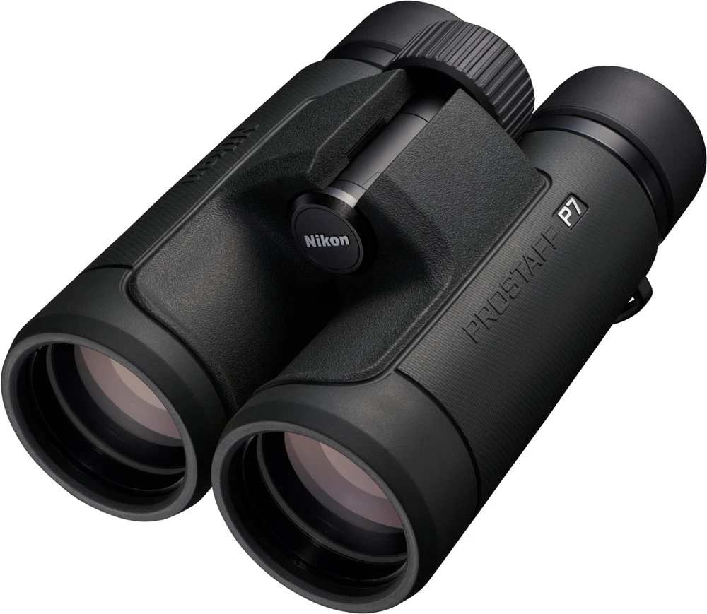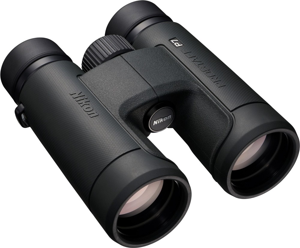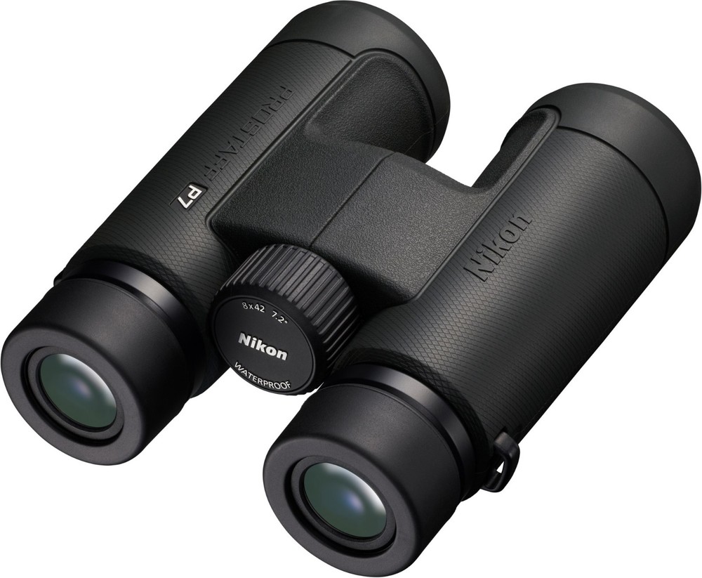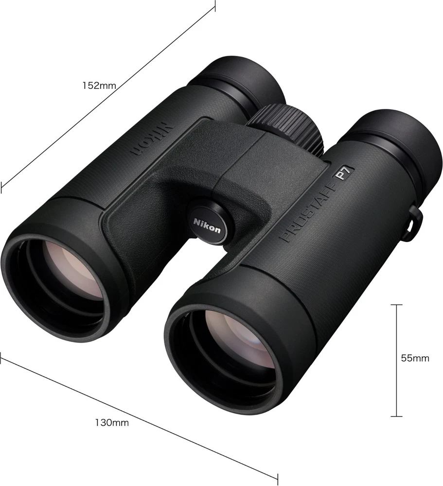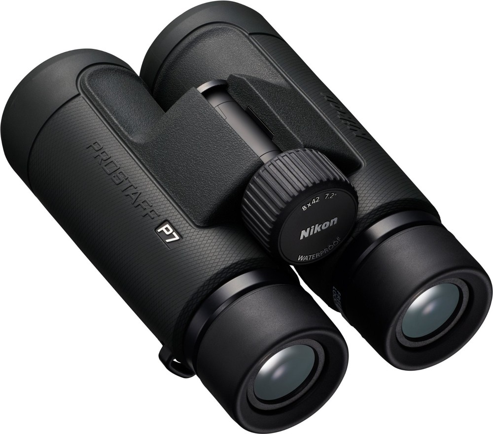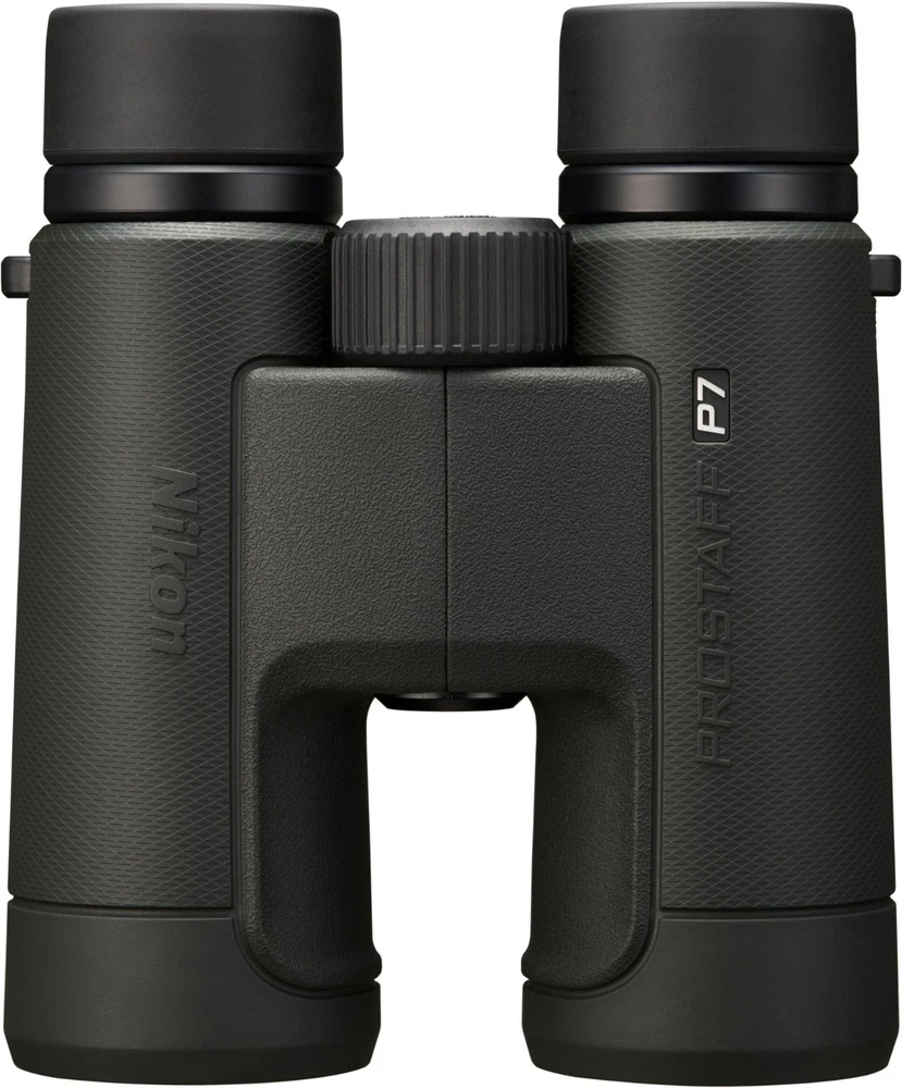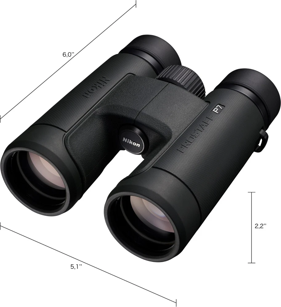 Nikon Prostaff P7 8 x 42 Binoculars Features Full-size 42 mm front objectives gather more light across the wide field of view—377 ft. at 1,000 yards—even as the daylight is fading Phase-correction coating is applied to the roof prisms for increased definition and clarity Dielectric high-reflective multilayer prism maximizes light transmission across the visible range Often reserved for the highest-end binoculars, the diopter ring locks into place so you can set it and forget it An oil- and water-repellent coating is applied to both the objective and eyepiece lenses; simply wipe away moisture, fingerprints and smudges Waterproof down to 3.3 ft. in case of mishaps at the water's edge or if you're caught in inclement weather (not intended for underwater use) The glass used is lead- and arsenic-free Turn and slide the retractable eyecups for use with eyeglasses; extend them to your ideal position for comfortable naked-eye viewing Dark green rubber-armored body provides nonslip grip and protection from the occasional drop or bump Lightweight body uses strong fiberglass-reinforced polycarbonate resin Includes a neoprene soft case, lanyard and instruction manual Shipping Notice: We ship to U.S. residential addresses only. Shipping is not available to freight forwarders, warehouses, commercial transit locations, or PO boxes. Orders placed with non-residential addresses will be held until a valid residential address is provided.