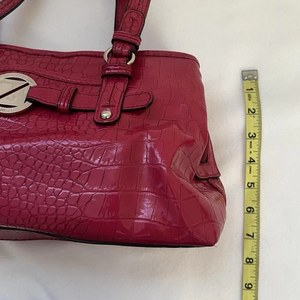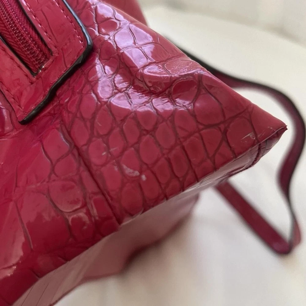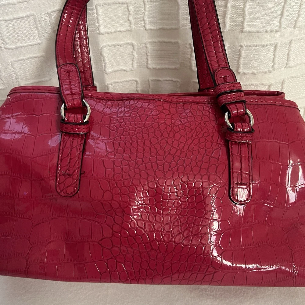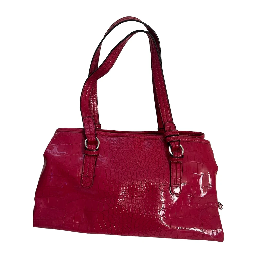 Red Y2k faux leather shoulder bag with silver hardware & crocodile print 🤍 this item is in great condition, tho with signs of wear (the bag has some minimal white stain at the bottom and side part, it’s a but deformed) but this is very spacious, handy and perfect for casual wear 🤍 this is giving y2k red hot girl vibes!!! length: 13” width: 7.5” #fauxcrocodileleather #y2k #hotgirlred #y2khandbag #nine&co