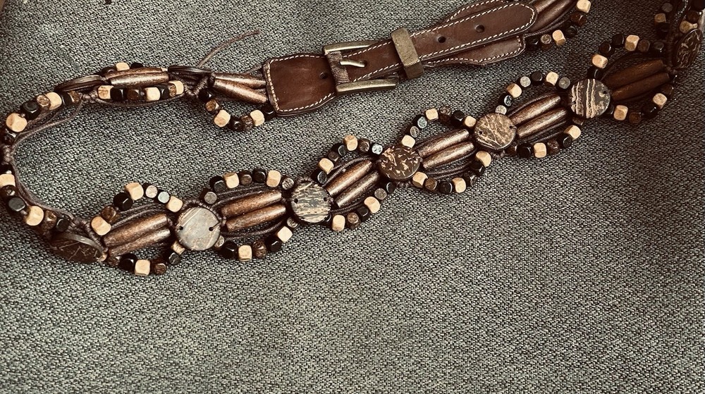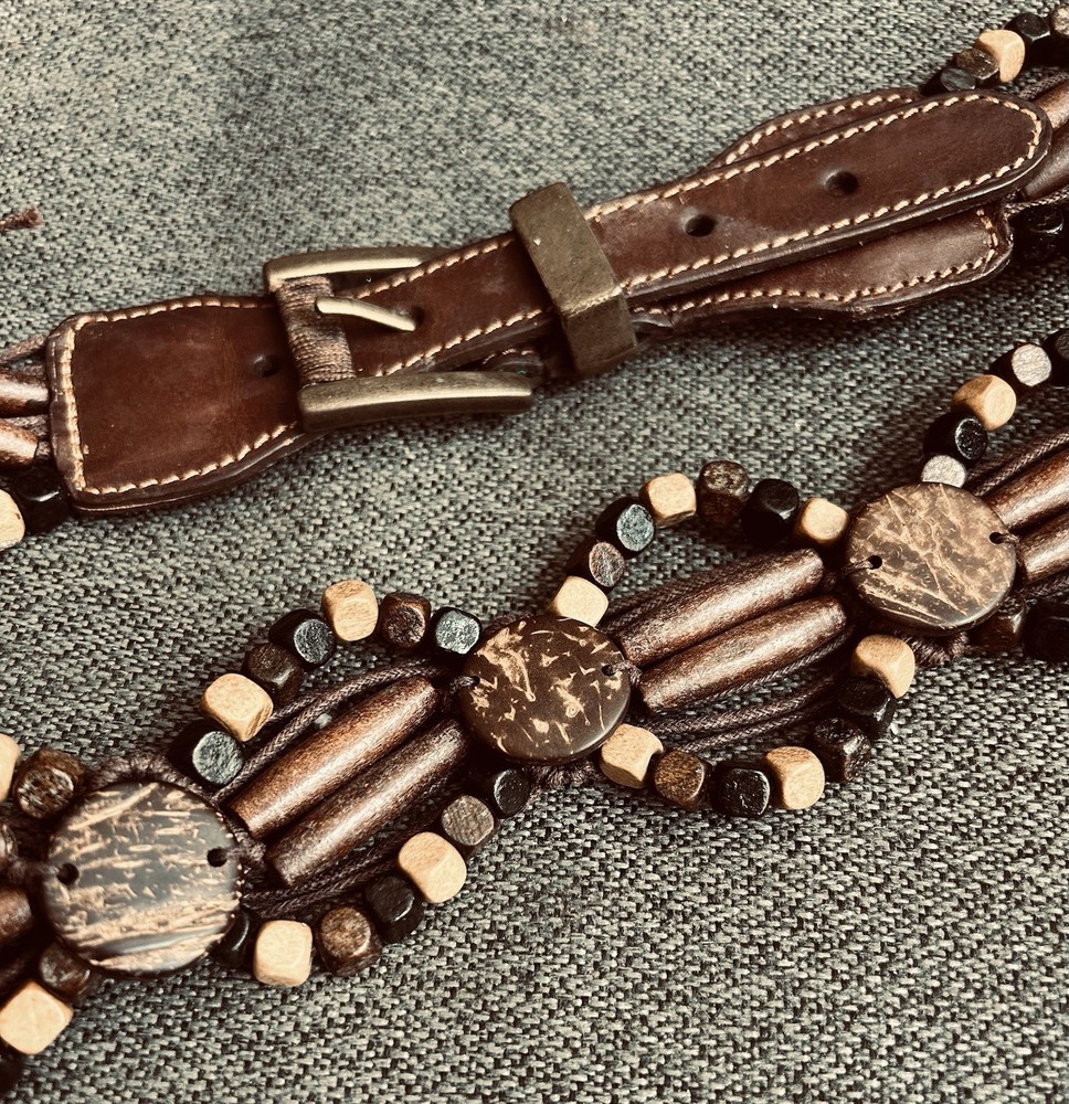 The NINE WEST Laced Brown Leather Belt is a stylish accessory for both men and women, featuring a unique laced pattern and brass buckle with bead accents. The XL size and medium belt width make it a versatile piece that can add a touch of boho or 90s flair to any outfit. Made from high-quality leather with brass hardware, this waist belt is both fashionable and durable, perfect for adding character to your wardrobe. 32” long with 5 strap holes for adjustment