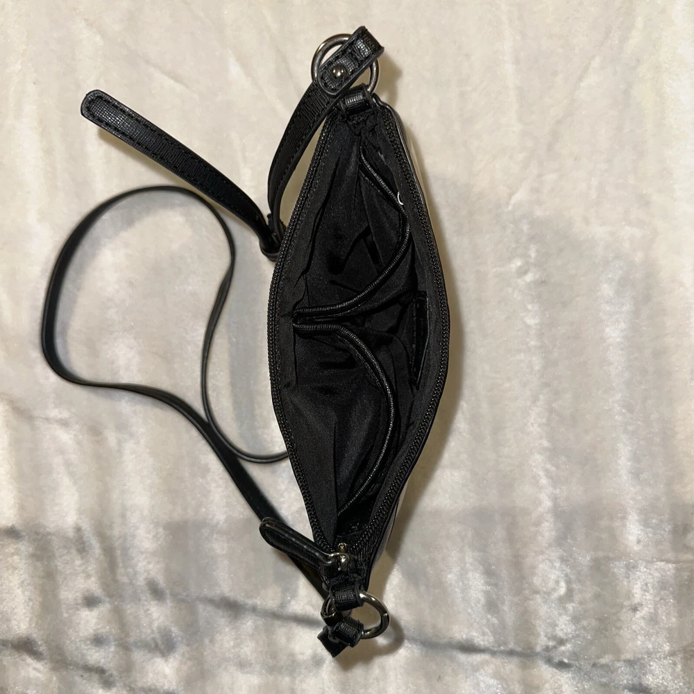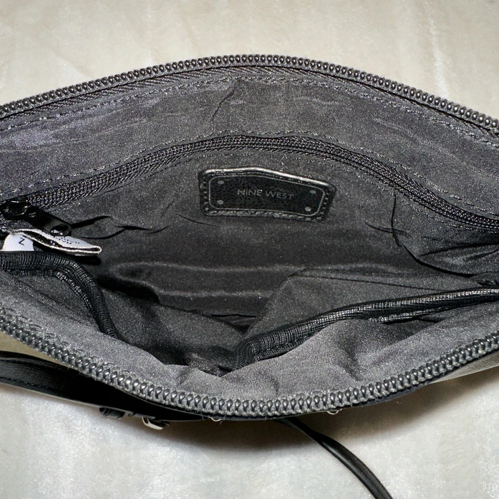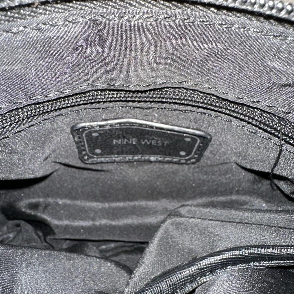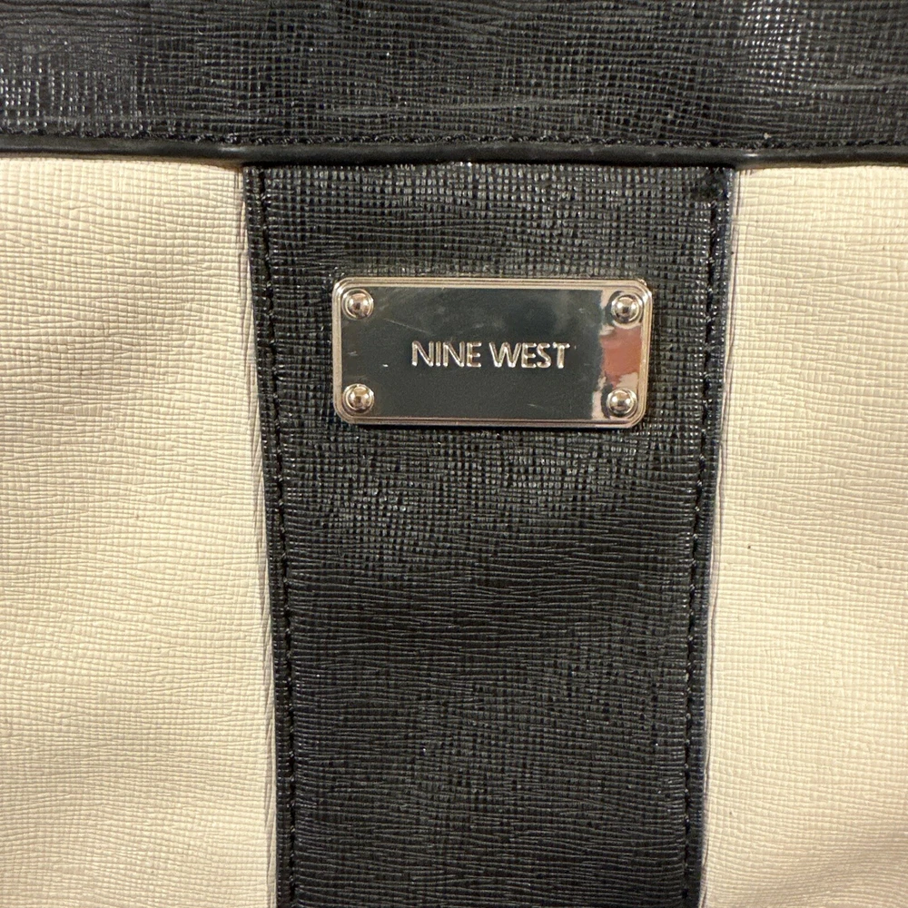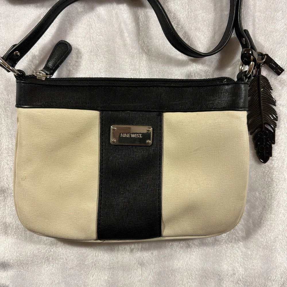 This is nice bag to go out with has a small mark on the front the keychain is awesome a metal feather with a name refer to photo This Nine West shoulder bag is the perfect accessory for any outfit. The exterior is made of faux leather in a multicolor design, featuring a white and black feather pattern. The bag comes with a strap for easy carrying and a keychain for added convenience. This small bag is ideal for women on-the-go, with a stylish design that can complement any outfit. Whether you're running errands or heading out for a night on the town, this Nine West bag is the perfect choice.