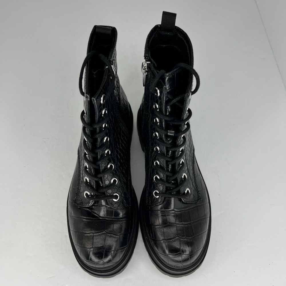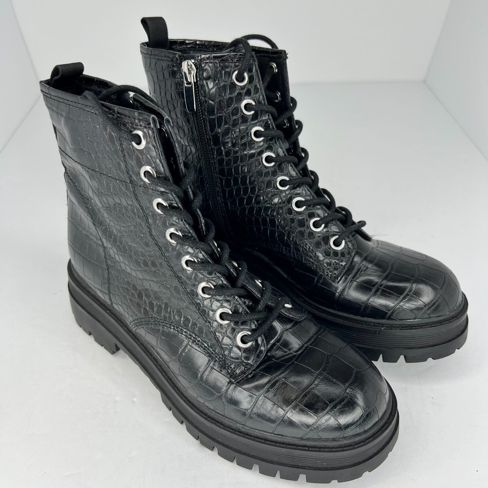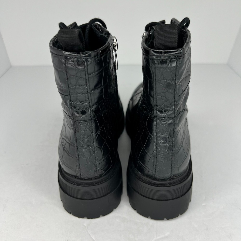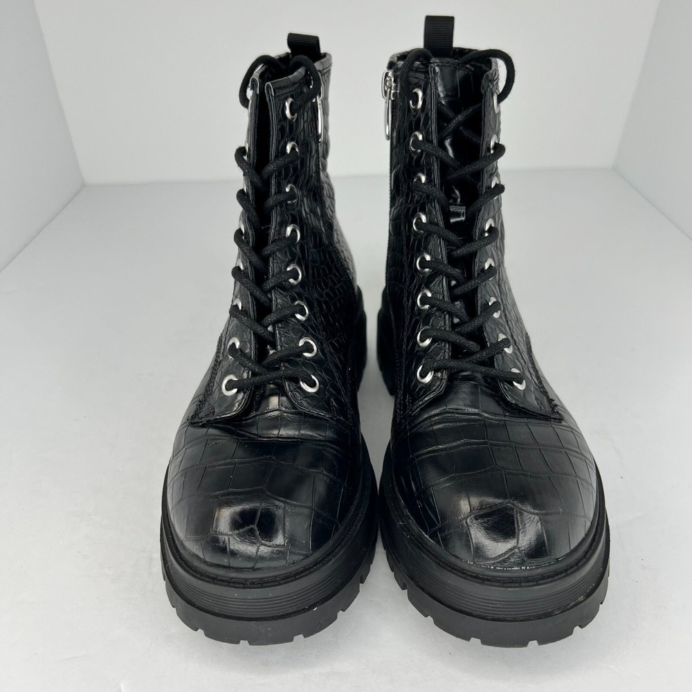 Elevate your style with these Nine West black croc print lace-up combat boots. Featuring a mid-calf shaft style and round toe shape, these boots are designed to provide both comfort and style. The boots are made with synthetic upper material and faux leather lining and outsole material, making them perfect for any season - winter, summer, fall, or spring. These boots have a solid pattern and a block heel style with a mid-heel height of 2-2.9 inches. The boots are branded with Nine West and are available in UK shoe size 4 and US shoe size 6.5. The boots are perfect for any woman who wants to add a touch of combat style to their wardrobe. 100% CUSTOMER SATISFACTION IS OUR GOAL! Our items are always carefully examined for condition, measured if necessary, and photographed in a climate controlled and smoke-free environment. We make every attempt to accurately describe and clearly picture the items we have for sale. Please, ALWAYS view all of the photos. We value your business and our goal is your complete satisfaction. FAST SHIPPING All items are packaged with care and shipped out the same or next business day via USPS, FEDEX, or UPS with tracking numbers so you are always informed. RETURNS We offer a 30-day return policy. All items must be unused and unopened in the condition in which they were received, with original packaging, and all accessories included for return. REVIEWS - CUSTOMER SATISFACTION - COMMUNICATION We aim to make you happy. After you receive your shipment, please leave a positive review . If you have concerns or questions about your order, please contact us so we can resolve the issue. We will do our best to make you satisfied. THANK YOU FOR YOUR BUSINESS!