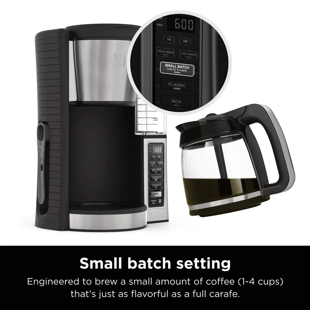 Ninja Coffee Brewer, Glass Carafe, CE250 is a 12-cup programmable coffee maker with custom brew strengths and a hotter brewing advanced boiler to make hot, flavorful, and never-bitter coffee. From a small batch (1-4 cups) to a full carafe, Classic or Rich strengths, you can expect the same great taste. Enjoy ultimate convenience with 24-hr delay brew, an adjustable warming plate, and a removable water reservoir. 2 Brew Styles: Classic or Rich, each brew is flavorful and never bitter with custom brew strengths Hotter Brewing Technology: Delivers even saturation and temperature control for ultra-flavorful coffee Wake up to Hot Coffee: 24-hour programmable delay brew allows you to prepare your brew up to a day in advance Adjustable Warming Plate: Keep coffee fresh and flavorful up to 4 hours Removable Water Reservoir: Conveniently carry the 60-oz. water reservoir to your sink for easy filling Mid-Brew Pause: Pour yourself a cup before the brew is complete Small Batch Function: Ensure your coffee is never diluted when brewing a small batch (1-4 cups) Includes: 12-cup glass carafe, paper filter kit, Ninja scoop