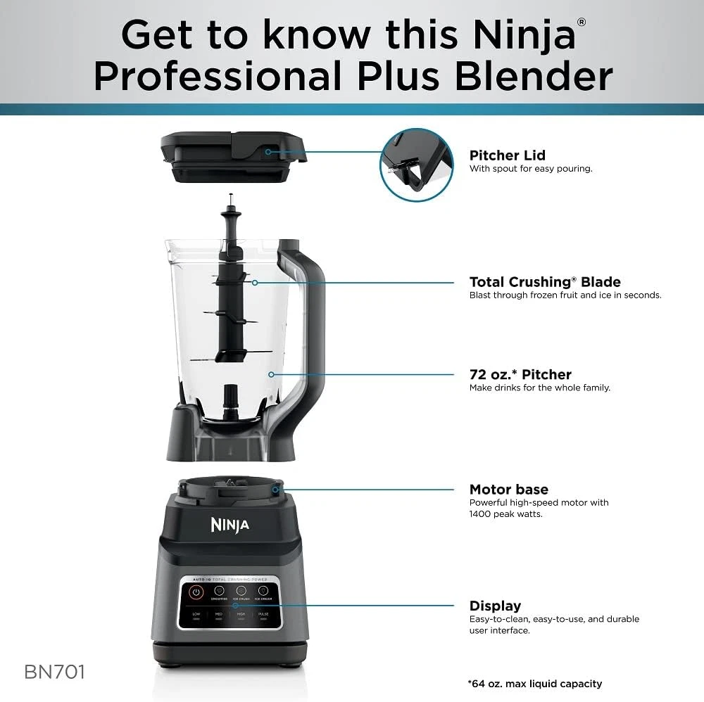 Store New Arrivals Add to Favorite View Feedback Contact Ninja BN701 Professional plus Blender, 1400 Peak Watts 3 Functions for Smoothies Description Item model number BN701 Style 72oz Blender Capacity 72 Fluid Ounces Power Source Corded Electric Country of Origin China Warranty Type limited warranty Controls Type [Physical Interface] Wattage 1400 watts Item Weight 8.1 Pounds Brand Ninja Manufacturer SharkNinja Is Dishwasher Safe Yes Blade Material Stainless Steel Number of Speeds 4 Included Components 72-Oz.Total Crushing Pitcher, Recipe Inspiration Guide, Stacked Blade Assembly And Lid, 1400-Peak-Watt Motor Base, Instruction Booklet, Quick Start Guide Item Weight 8.1 pounds Special Feature Multiple Speeds, Pre-Programmed, Pulse Technology, Dishwasher Safe Color Dark Grey Global Trade Identification Number 10622356561881 Voltage 120 Volts Recommended Uses For Product Blending, Crushing, Ice Crush Material Type Free BPA Free Product Dimensions 6.75"D x 9"W x 17.5"H Size 72 oz. Pitcher (64 oz max liquid capacity) MORE POWERFUL MOTOR: The Ninja Professional Plus Blender with Auto-iQ features a new modern design and a more powerful motor than Ninja's original Professional Blender. (Versus BL610, based on operating wattage.) POWERFUL CRUSHING: Ninja Total Crushing Blades give you perfectly crushed ice for your smoothies and frozen drinks with 1400 peak watts of professional power. 3 VERSATILE FUNCTIONS: 3 preset Auto-iQ programs allow you to create smoothies, frozen drinks, and ice cream, all at the touch of a button. AUTO-IQ TECHNOLOGY: take the guesswork out of drink making with intelligent programs that combine unique timed pulsing, blending, and pausing patterns that do the work for you. XL BLENDING CAPACITY: The 72-oz. Total Crushing Pitcher is great for making large batches for the whole family. (64-oz. max liquid capacity.) RECIPE INSPIRATION: Includes 15-recipe Inspiration Guide to help create delicious smoothies, frozen drinks, and more. DISHWASHER SAFE: BPA-free pitcher and stacked assembly blade are easy to clean and dishwasher safe on the top rack. WHAT’S INCLUDED: 1400-Peak-Watt Motor Base, 72-oz.Total Crushing Pitcher, Stacked Blade Assembly, Lid, Recipe Inspiration Guide, Instruction Booklet & Quick Start Guide. The Ninja Professional Plus Blender with Auto-iQ features a new modern design and a more powerful motor than Ninja's original Professional Blender.* Ninja Total Crushing Blades give you perfectly crushed ice for your smoothies, frozen drinks, and ice cream. The 72 oz.** Total Crushing Pitcher is great for making large batches for the whole family with 1400 peak watts of professional power. Auto-iQ Technology provides preset programs that do the work for you, no guesswork required. *Versus BL610, based on operating wattage **64 oz. max liquid capacity. ABOUT US We offer the best prices around on high quality products. Our E-store includes media such as books, movies, music and games while offering electronics, toys, sporting apparel, clothing, tools, general home, garden items and more. SHIPPING We are always working hard to ensure your package arrives as soon as possible. Please understand that some factors like weather, high postal traffic, and the performance of shipping companies are outside of our control. We offer free shipping to the lower 48 states and ship within 2 business days of payment, usually sooner. We do not accept P.O. Boxes. Please provide a physical address. RETURNS We offer a 30-Day Return Policy on items which you are not completely satisfied with. You have the option for a full-refund or an exchange of the item. No returns are available on items shipped outside of the USA. PAYMENT We accept PayPal. CONTACT US This page content is yet to come Please ad us to your favorite seller and visit again later Thank You CUSTOMER SATISFACTION We try our very best to make sure every customer is completely satisfied. If there's a problem, message us! We're happy to help.