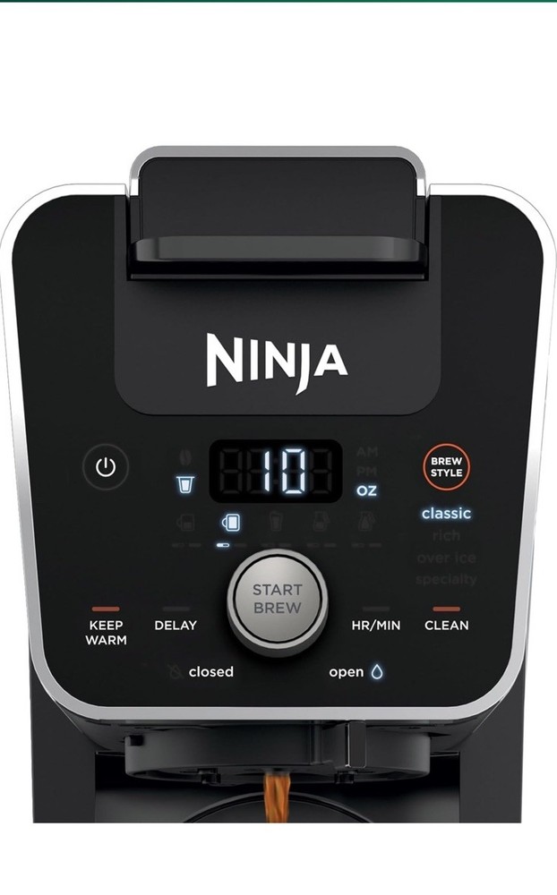 The Ninja CFP451CO DualBrew System 14-Cup Coffee Maker is a versatile pod coffee machine that can make various coffee drinks such as espresso, latte macchiato, and cappuccino. With a 3.3 bar pressure system, this machine can create rich and flavorful brews. It features a sleek black glass design with a matte finish, along with an analog control panel for easy operation. The dualbrew system allows for both single-serve pods and ground coffee, making it a convenient option for coffee lovers who prefer different brewing methods. Additionally, the built-in frother and water tank make it easy to create specialty drinks and keep your coffee maker clean and tidy.
