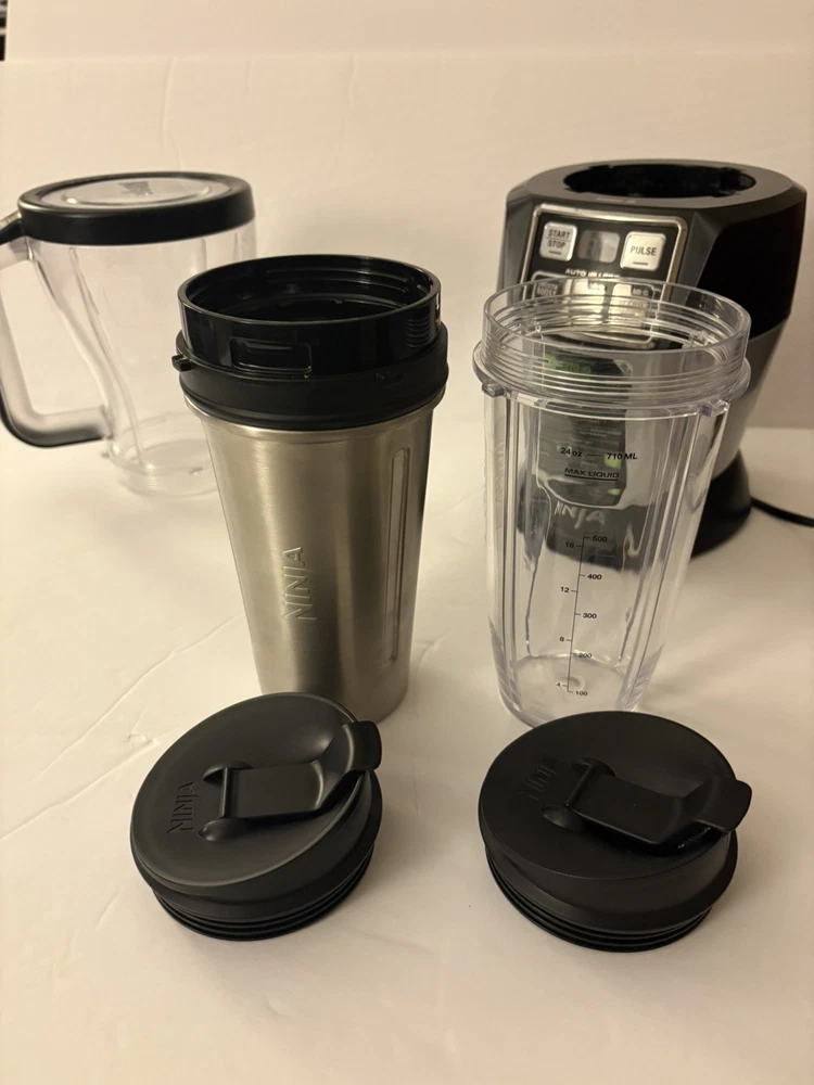 Tested and works but DOES NOT COME WITH ANY BLADES OR RUBBER GASKETS You will get what you see in the pictures only which is two to-go cups with lids, a pitcher (no bottom as the blade fits on the bottom and needs to be replaced), and the working base unit. Cups and pitcher are dishwasher safe 1100 watt mx 120 V Nutri Ninja Auto iQ Pro Blender with 2 To Go Cups and Lids | BL487