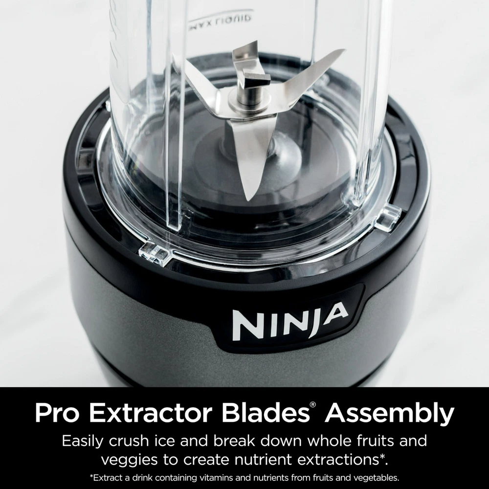 The Ninja® Nutri-Blender is a powerful 700-watt personal drink maker that crushes ice and pulverizes tough ingredients for smoothies, shakes, and extractions you can take on the go. Simply push down to blend until reaching your desired consistency, then twist off the blades and twist on a Spout Lid for easy sipping in the same cup. Two 20 oz. to-go cups are included with two Spout Lids. It's the perfect tool for making healthy recipes in the kitchen, and comes with a 10-recipe inspiration guide to get you started. Clean up is easy with dishwasher-safe cups, blades, and lids. Authorized resellers include Walmart or SharkNinja only. SharkNinja Warranty is void and quality product cannot be guaranteed for any Ninja and Shark product that is purchased from sellers other than Walmart or SharkNinja. The intuitive 700-watt push-to-blend motor base powers through everything inside the cup to give you the best of Ninja blending. Pro Extractor Blades Assembly easily crushes ice and breaks down whole fruits and veggies to create nutrient extractions*. *Extract a drink containing vitamins and nutrients from fruits and vegetables. Blend directly in one of the two included 20 oz. Ninja To-Go Cups and then twist on a Spout Lid to enjoy on the go. Check out the Recipe Inspiration Guide to easily prepare smoothies, shakes, and extractions. Cups, lids, and blade assembly are dishwasher safe.