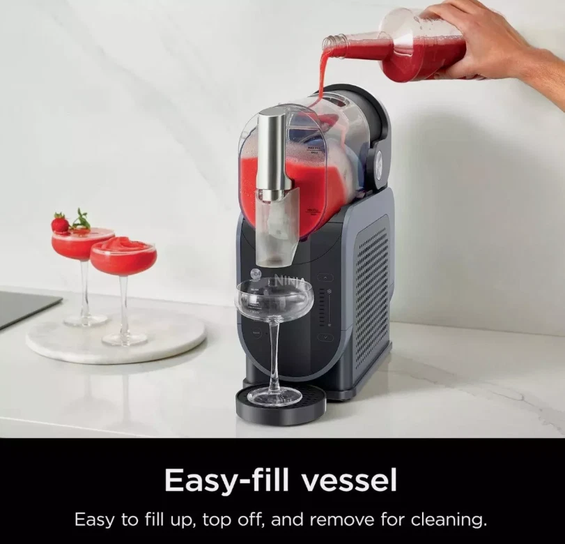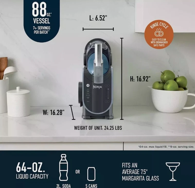 Ninja Slushi FS301 Professional Maker with RapidChill Technology, 88 oz Drink & Slushie Machine, 5 Preset Programs, Frozen Margaritas, Frappés, and More, Premium Accents, Black NO ICE NEEDED : RapidChill Technology is our innovative two-part system that spins an auger around a cooling cylinder to freeze liquid evenly and maintain optimal temperature for perfect icy treats. A SUPERIOR FROZEN DRINK EXPERIENCE : With this versatile machine, turn your favorite liquids into smooth, flavorful frozen drinks: wine, coffee, soda, juice, chocolate milk, and more. Simply pour the liquid in, select your program, and watch it transform. ONE-TOUCH FROZEN DRINKS : Temperature and texture controls deliver consistently smooth results in up to 60 minutes at max capacity. *Creating drinks can take 15-60 min depending on ingredients, volume, and starting temperature. Must include sugar to slush. SELF-SERVE HANDLE WITH POUR SPOUT: Enjoy the convenience of the ergonomically-designed comfort handle and the no-drip, no-mess pour spout. 5 PRESET SETTINGS : Automated programs give you tailored temperature settings to yield the perfect output every time. TEMPERATURE CONTROL: Customize whether you want the output to be thicker or thinner than the preset setting. EASY-FILL VESSEL : Easy to fill up, top off, and remove for cleaning. Creates slush quickly and keeps drinks frozen for up to 12 hours. HASSLE-FREE CLEANUP : Easy to clean with dishwasher-safe parts. Features a detachable lid and drip tray allowing for easier cleaning between uses. WHISPERCHILL COMPRESSOR : Quietly keeps your slushed treats at the perfect temperature and texture for up to 12 hours. HACK YOUR SUGAR-FREE RECIPES : Sugar-free recipes will not slush properly on their own. Add one of our recommended sugar substitutes to the recipe to ensure perfect slushing.