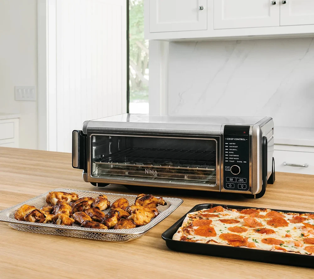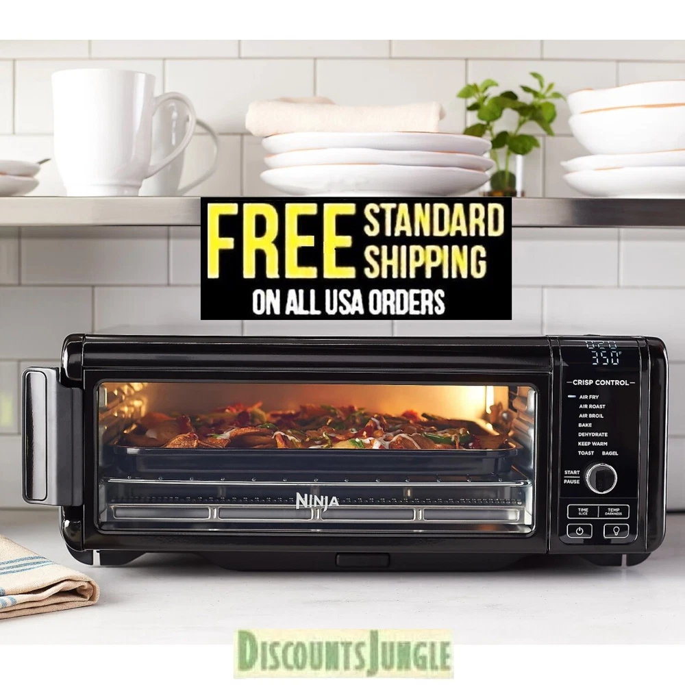 MANUFACTURER REFURBISHED w/Warranty! Fast Free Shipping Ninja SP101 Foodi 8-in-1 Digital Air Fry, Large Toaster Oven, Flip-Away for Storage, Dehydrate, Keep Warm, 1800 Watts, XL Capacity, Stainless Steel--Renewed ( Ninja SP101HB - BLACK ) Product description The Ninja Foodi digital air fry oven packs a lot of features and cooking Capacity in a small countertop footprint. Air fry, air roast, air broil, bake, bagel, toast, dehydrate, and keep warm- all in one appliance- and when you're done cooking, reclaim your counter space by simply flipping the oven up and away to clean and store. From the manufacturer Cook, flip, clean. Cook Fast and Evenly Unique design promotes speed and even cooking results, including 60-second preheat and family-sized meals in as little as 20 minutes. Flip Up to Store When the oven is not in use, reclaim your counter space by simply flipping the oven up and away to store. Clean Easily and Efficiently A removable back panel allows you to easily access the interior for deep cleaning. Model Name SP101 Foodi 8-in-1 Brand Ninja Color--BLACK Item Weight 15.72 Pounds Item Dimensions LxWxH 19.72 x 7.56 x 14.96 inches About this item The ultimate meal-making machine with 8-in-1 functionality: air fry, air roast, air broil, bake, bagel, toast, dehydrate, and keep Warm all in one powerful 1800-watt appliance. Reclaim your counter space: takes up 50% less space when you flip it up and away to store against your backsplash. Air fry: up to 75% less fat than traditional frying methods. Tested against hand-cut, deep-fried French fries. Xl capacity: 45% larger usable pan cooking area vs. The flat surface area of the Cuisinart toa-60 and toa-65 pan. Fits a 13" Pizza, up to 9 slices of toast or 6 chicken breasts (6–8 oz. Each). Easy cleaning: Includes a removable crumb tray and an easily accessible back panel for deep cleaning. Fast cooking: cooks up to 60% faster than a traditional oven with air roast; 60 second preheat; full meals in as little as 20 minutes. Even baking: up to 40% more-even baking than the Cuisinart air fry oven toa-60. Digital crisp control technology: precision-controlled temperature, heat source, and airflow for ultimate versatility and optimum cooking performance. Toast and bagels done the way you like: Use the toast darkness Selector to get it just right. Includes: wire rack; 13”x13” nonstick, dishwasher-safe sheet pan; dishwasher-safe air fry basket, removable crumb tray. Dimensions: 19. 7” W x 7. 5”H x 15. 1”D; when flipped up: 19. 7" 15. 1”H x 7. 5”D