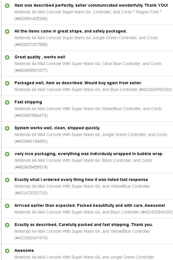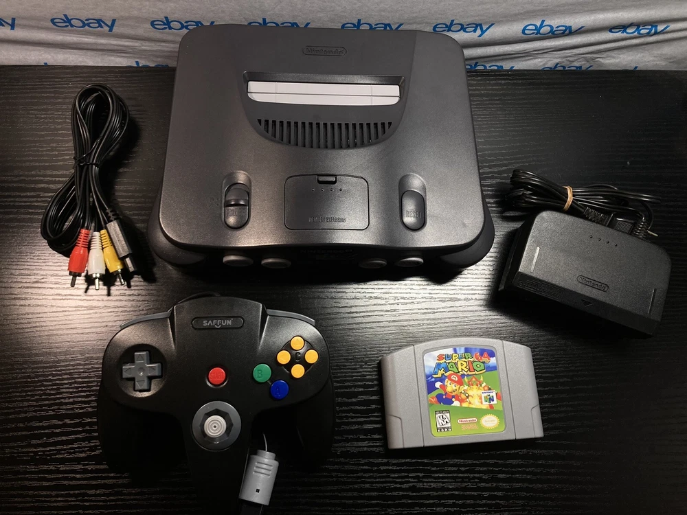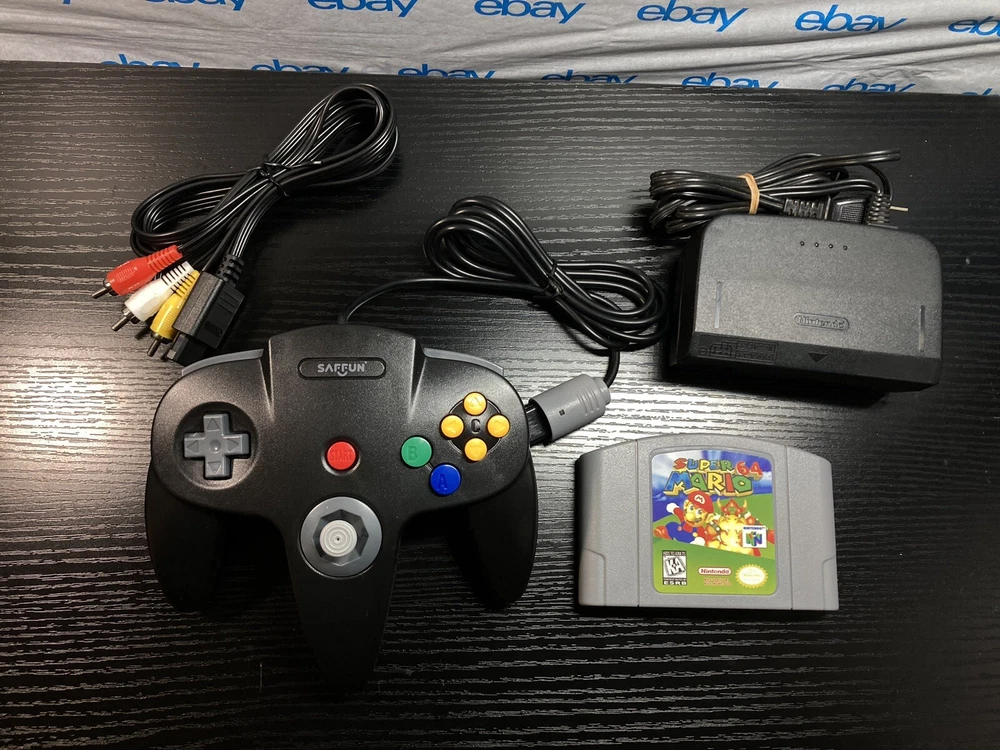 Nintendo 64 N64 Console with Super Mario 64, Black Controller, and Cables. Includes Power Cord, 3rd party av cables, and controller. The controller is a brand new Black 3rd party controller . This listing has 30 day free returns. Super Mario 64 is a new high quality copy. Shipped with USPS Priority Mail with same day handling before 11a.m. est on weekdays so you can play as soon as possible!!! Feel free to ask any questions you have! Every item will be packed carefully with bubble wrap like I would want to receive it!
