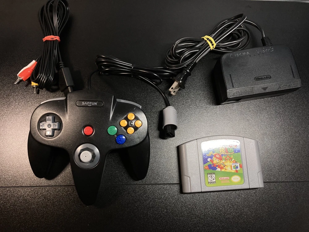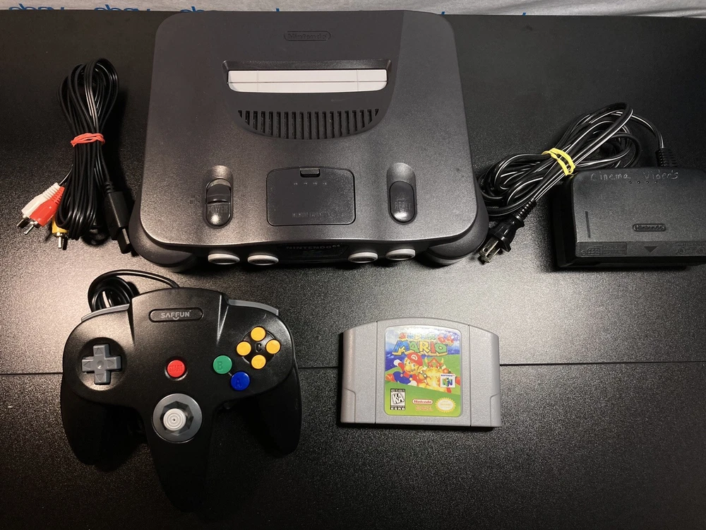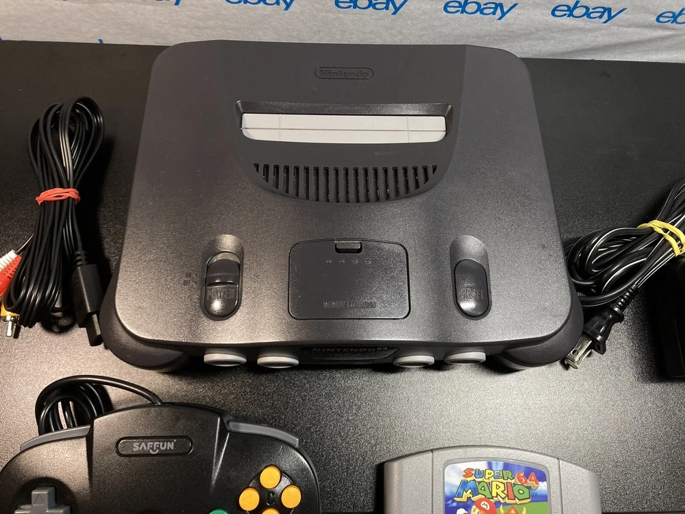 Nintendo 64 N64 Console with Super Mario 64, Black Controller, and Cables. Includes Power Cord, 3rd party av cables, and controller. The controller is a brand new Black 3rd party controller . This listing has 30 day free returns. Super Mario 64 is a new high quality copy. Shipped with USPS Priority Mail with same day handling before 11a.m. est on weekdays so you can play as soon as possible!!! Feel free to ask any questions you have! Every item will be packed carefully with bubble wrap like I would want to receive it!