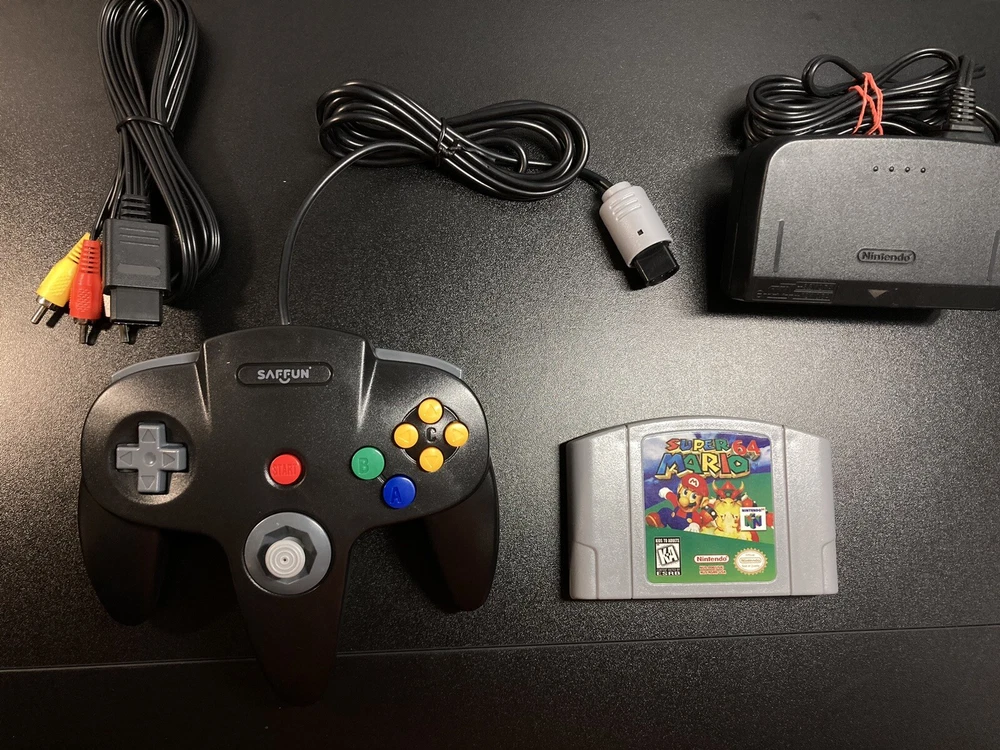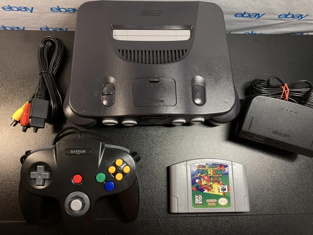 Nintendo 64 N64 Console with Super Mario 64, Black Controller, and Cables. Includes Power Cord, 3rd party av cables, and controller. The controller is a brand new Black 3rd party controller . This listing has 30 day free returns. Super Mario 64 is a new high quality copy. Shipped with USPS Priority Mail with same day handling before 11a.m. est on weekdays so you can play as soon as possible!!! Feel free to ask any questions you have! Every item will be packed carefully with bubble wrap like I would want to receive it!