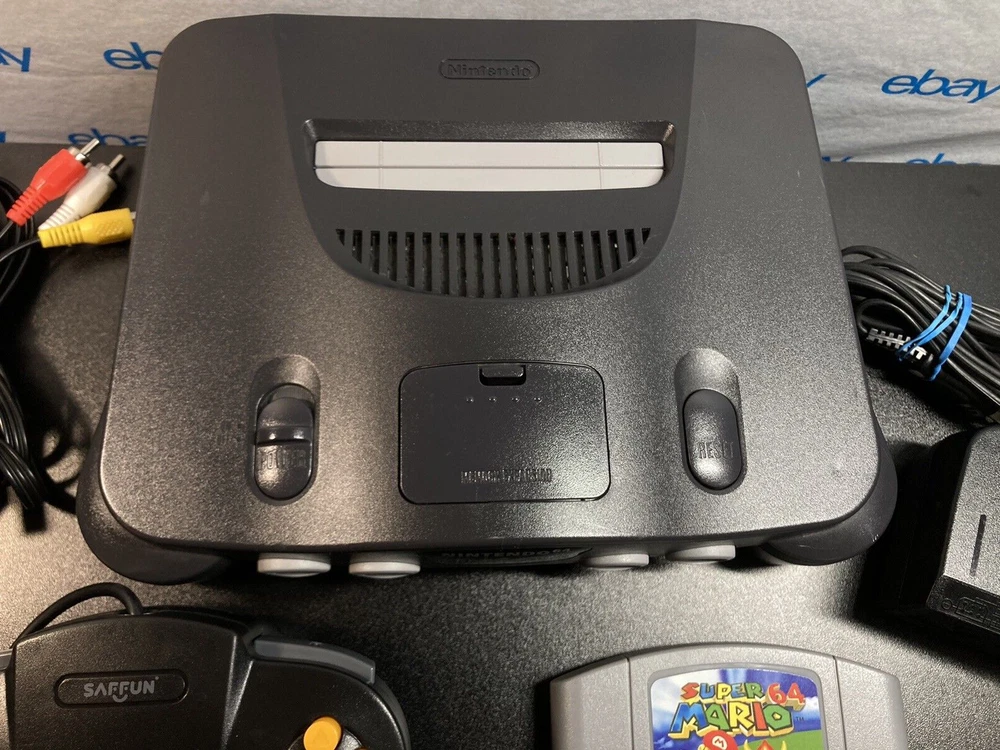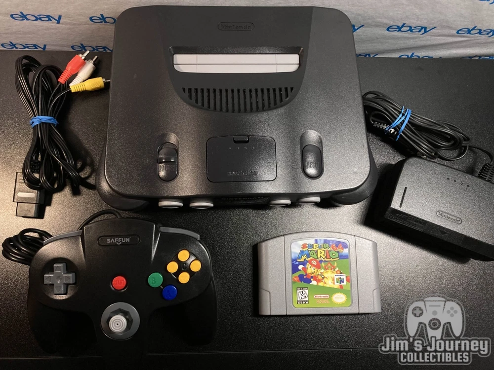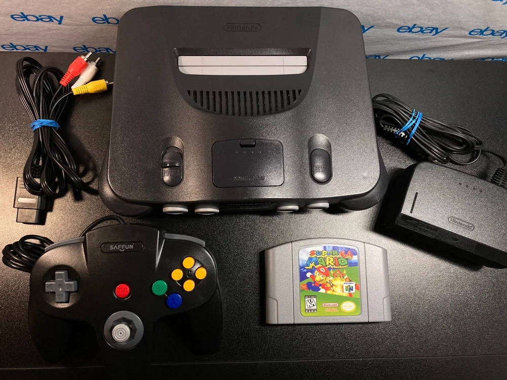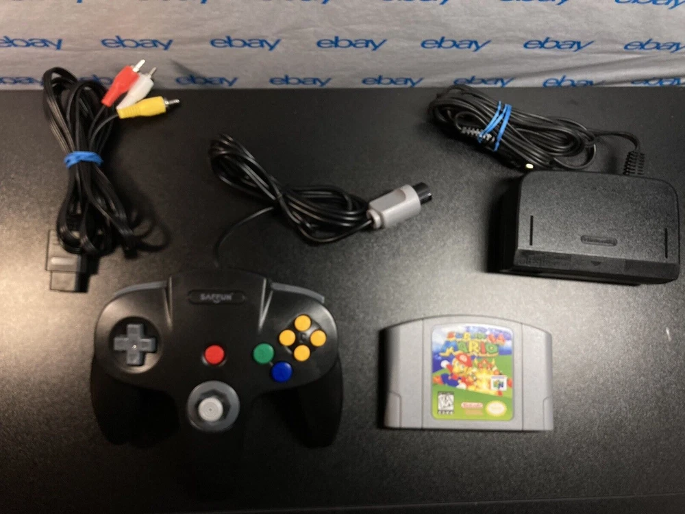 Nintendo 64 N64 Console with Super Mario 64, Black Controller, and Cables. Includes Power Cord, 3rd party av cables, and controller. The controller is a brand new Black 3rd party controller . This listing has 30 day free returns. Super Mario 64 is a new high quality copy. Shipped with USPS Priority Mail with same day handling before 11a.m. est on weekdays so you can play as soon as possible!!! Feel free to ask any questions you have! Every item will be packed carefully with bubble wrap like I would want to receive it!