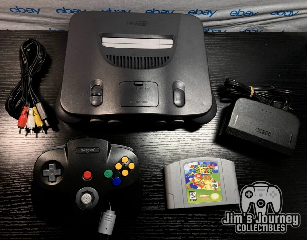 Nintendo 64 N64 Console with Super Mario 64, Black Controller, and Cables. Includes Power Cord, 3rd party av cables, and controller. The controller is a brand new Black 3rd party controller . This listing has 30 day free returns. Super Mario 64 is a new high quality copy. Shipped with USPS Priority Mail with same day handling before 11a.m. est on weekdays so you can play as soon as possible!!! Feel free to ask any questions you have! Every item will be packed carefully with bubble wrap like I would want to receive it!