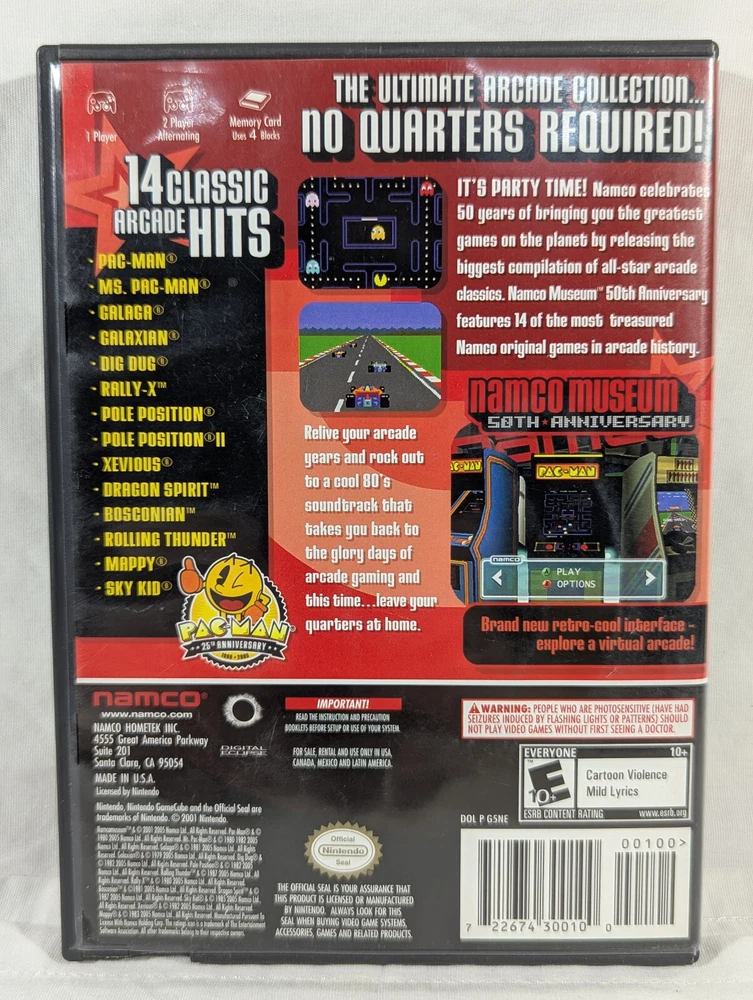 Nintendo GameCube Namco Museum 50th Anniversary Arcade PacMan Galaga CIB Tested CONDITION Overall excellent condition. No damage to inserts. Disc has minor surface scratches that do not affect game play. Case has some smudges. Tested and works as expected. Look at the pictures closely as this is the exact item you're purchasing AND IS AS IS. Please ask any questions before buying. Disclaimer ** Please note: We put up a varied collection of items and are not experts in every area, so descriptions are our best guess as to what something is. We try to research each item to the best of our ability, but it is the buyer's responsibility to know what they are buying. ** Payments Payment is due the day of the sale or close of auction. Shipping We use eBay's calculated shipping to determine the cost based on the size & weight of the box, along with the shipping destination. Occasionally eBay's calculated shipping may over-calculate. We refund any overages that may occur. Click here to view our other auctions and items for sale. We ship to the U.S. and internationally through the eBay International Shipping program.
