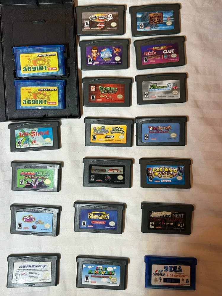 The product is a wholesale bundle of 20 Nintendo Game Boy Advance games. The games included in the lot cover a wide range of genres such as, Board Games, Art Game, Family/Kids, Quiz & Trivia, Arcade, Puzzle, Battle, Fantasy, Strategy, Mystery, Role Playing, Racing, Robot, Action & Adventure, and Sports. The games are suitable for all ages with an E-Everyone rating. Games Included 2X Arcade 369 Games in 1 Sega Game Gear + Master System Games Disney LILO and STITCH MARIO LUIGI SUPERSTAR SAGA Super Mario World/ Super Mario Advance 2 Yoshi Island / Super Mario Advance 3 Polly Pocket FIFA 2006 Tony Hawk Pro Skater 2 Jimmy Neutron Frogger Adventures Old Parents Shadow Showdown Spy Hunter/ Super Sprint Disney Brother Bear Battleship/ Risk/ Clue Disney Kim Possible 3 Pac-Man / Pinball Advance Mortal Kombat Deadly Alliance Ultimate Brain Games All in Excellent Working Condition! $320 Sale For All In Pics Comes out $60 each GBA And $10 a game 20 games some games worth more Free Case and Sling Comes with 2 Gameboy Advance Color with Cover Grips One Game Boy To Game Boy Connection Cable Two Carrying Cases One Carry and Belt, and One Sling Crossbody One New Screen One Extra Battery Cover Four Transparent Game Cases Ships USPS 2-3 Days Good Luck and Happy Bidding’s
