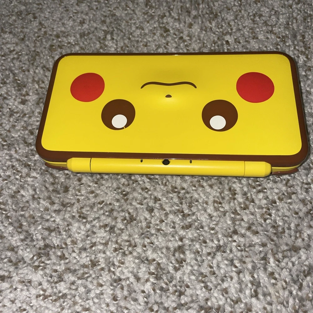 The product is a Nintendo 2DS XL handheld system in Pikachu Edition Yellow color. It has 128 GB storage capacity and comes with 100+ games pre-installed on a 128GB SD card. The system features Wi-Fi capability, internet browsing, and includes a stylus. It is suitable for use in the NTSC-U/C region (US/Canada) and is branded as Nintendo.