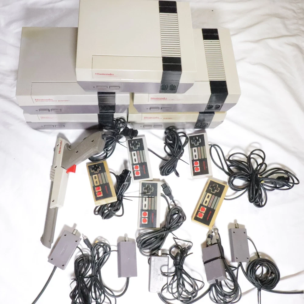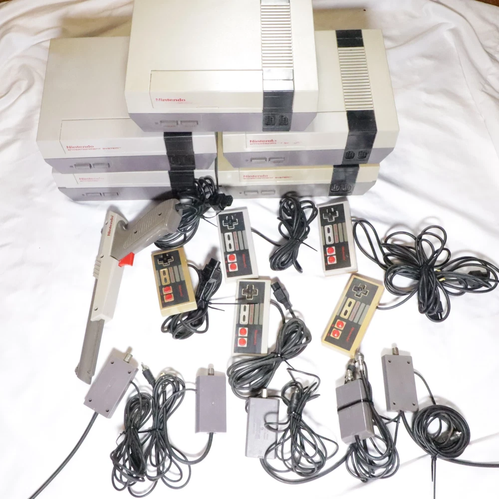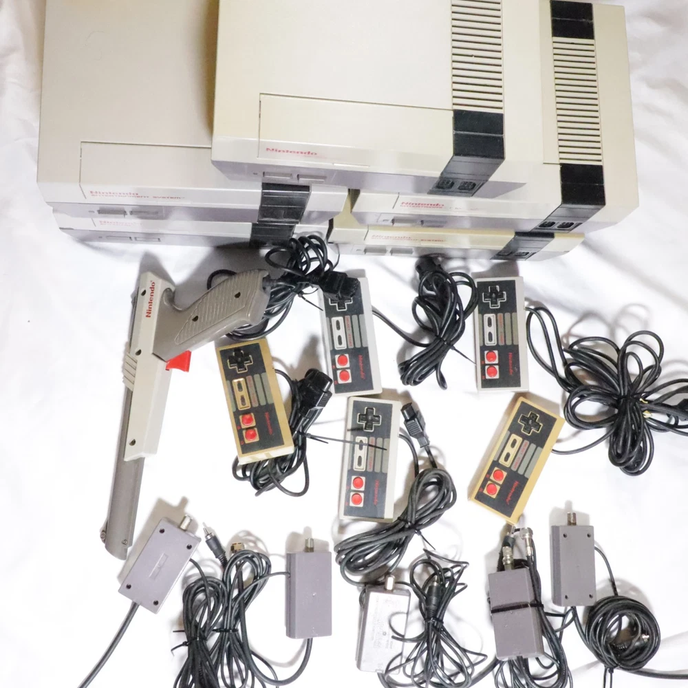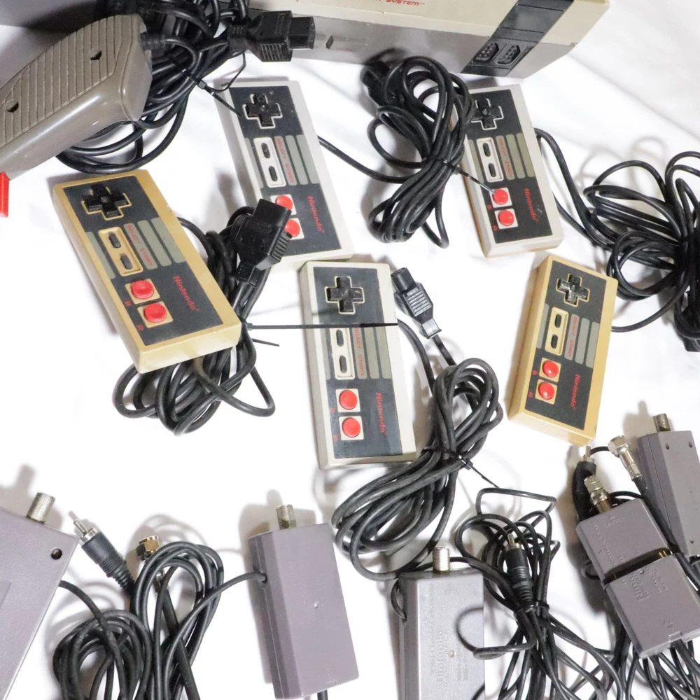 These are all untested and could work or could not. They are sold as is for testing and or repair , no power cords. 5 Original consoles 5 Original Controllers 5 Original RF Switches 1 Original Zapper Gun