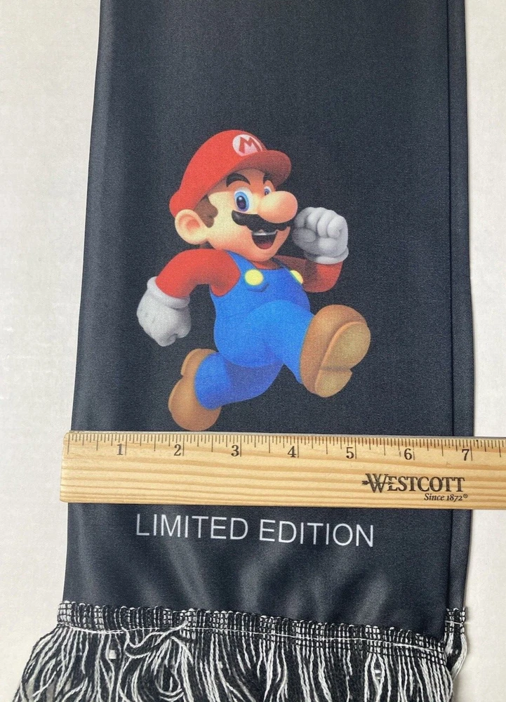 Nintendo Super Mario Bros. Mario scarf. Nintendo promotional item. Limited Edition, black polyester scarf with Mario graphics on both sides. Fringe on each end. Measures approx. 58 inches long and 6.5 inches wide. UPC = 045496705599. Free shipping to addresses in the United States. PAYMENT: Payment expected within 2 days. SHIPPING: Free Shipping to addresses in the United States. All International shipping is managed by eBay through the eBay International Shipping Program. CUSTOMER SERVICE: eBay message with questions. Positive feedback left when transaction is complete. Contact me with any issues so we can resolve them. THANKS FOR LOOKING! Check out my eBay Store and other listings, who knows what you may find.