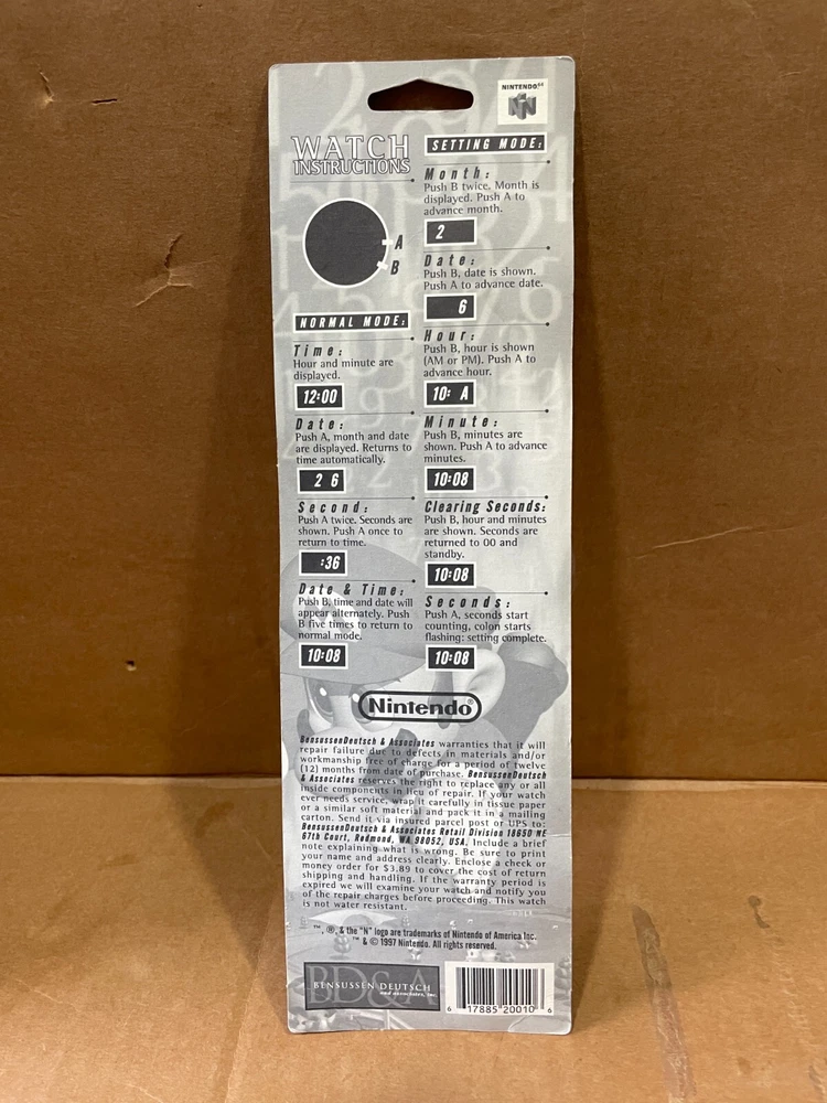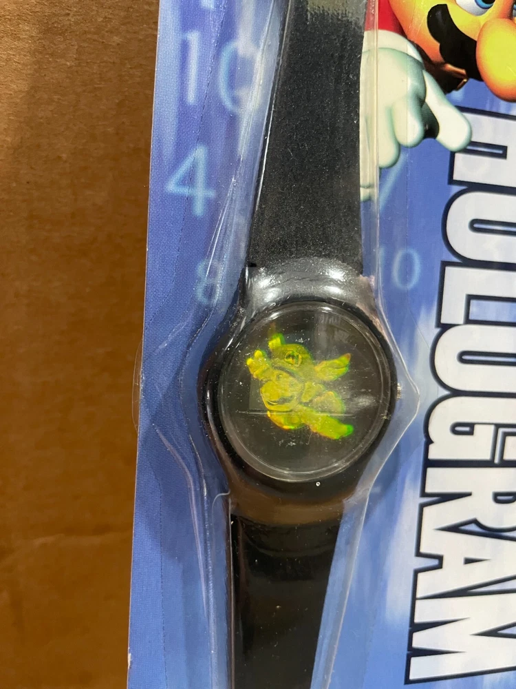 PLEASE READ THIS DESCRIPTION CAREFULLY.....Hard to find battery operated digital wristwatch featuring a hologram of the Nintendo video game animated character Super Mario on the watch cover. It comes in very nice unused/unworn condition on it's original blister packed card. Packaging is in excellent shape with a few light creases on the card and a little wear/scuffs on the blister pack over the image of Super Mario. Instructions are printed on the backside of the card. It has a vinyl band. It was made by Bensussen Deutsch & Assoc watch company, is fully licensed by Nintendo and is dated 1997. It will need a new battery as it is 25+ years old. Can't guarantee the watch will work even after a new battery is installed. This watch is being sold "as-is" with no returns. I have listed many different "character" watches. All are in wonderful unused condition. See my other listings. NOTE...I am not responsible for CUSTOMS fees or delays on items sent overseas.