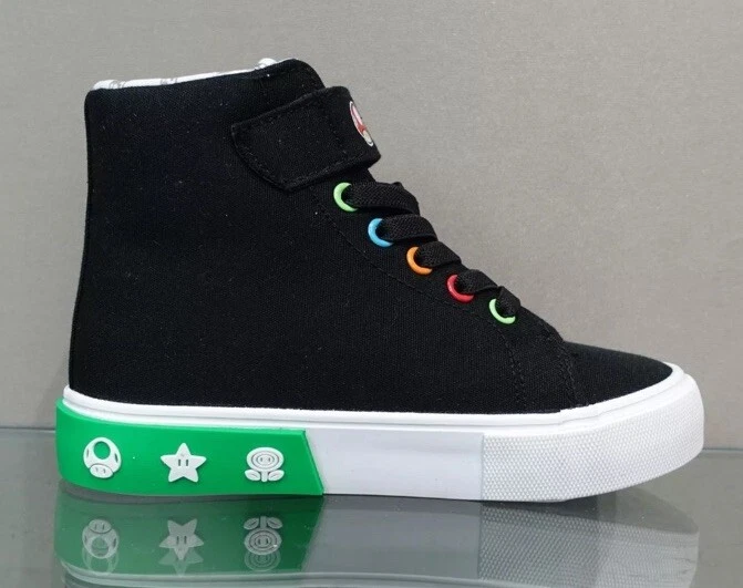 Step up your little one's shoe game with these stylish and comfortable Nintendo Super Mario sneakers. Featuring a high top shoe shaft style, lace-up closure, and round toe shape, these shoes are perfect for casual occasions and walking. The black canvas upper material is accented with a Luigi logo, making it a fun addition to any outfit. The moderately cushioned level and synthetic outsole material ensure durability and comfort for all-day wear. These shoes are available in size 13 and are suitable for boys. They are part of the Nintendo product line and are perfect for fans of the cartoon, TV, and movie characters. Get these trendy sneakers for your little one today!